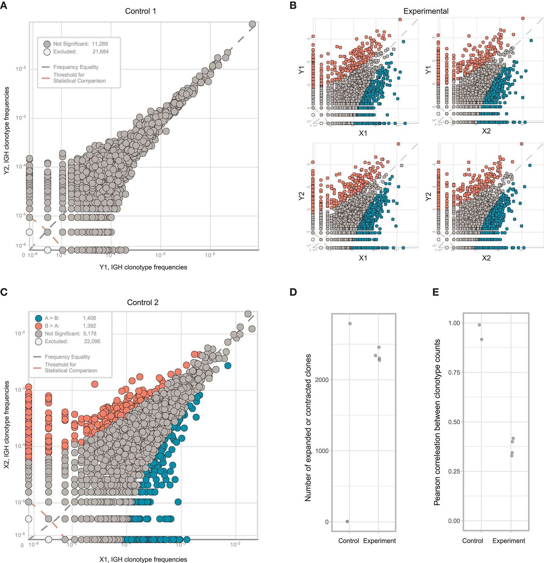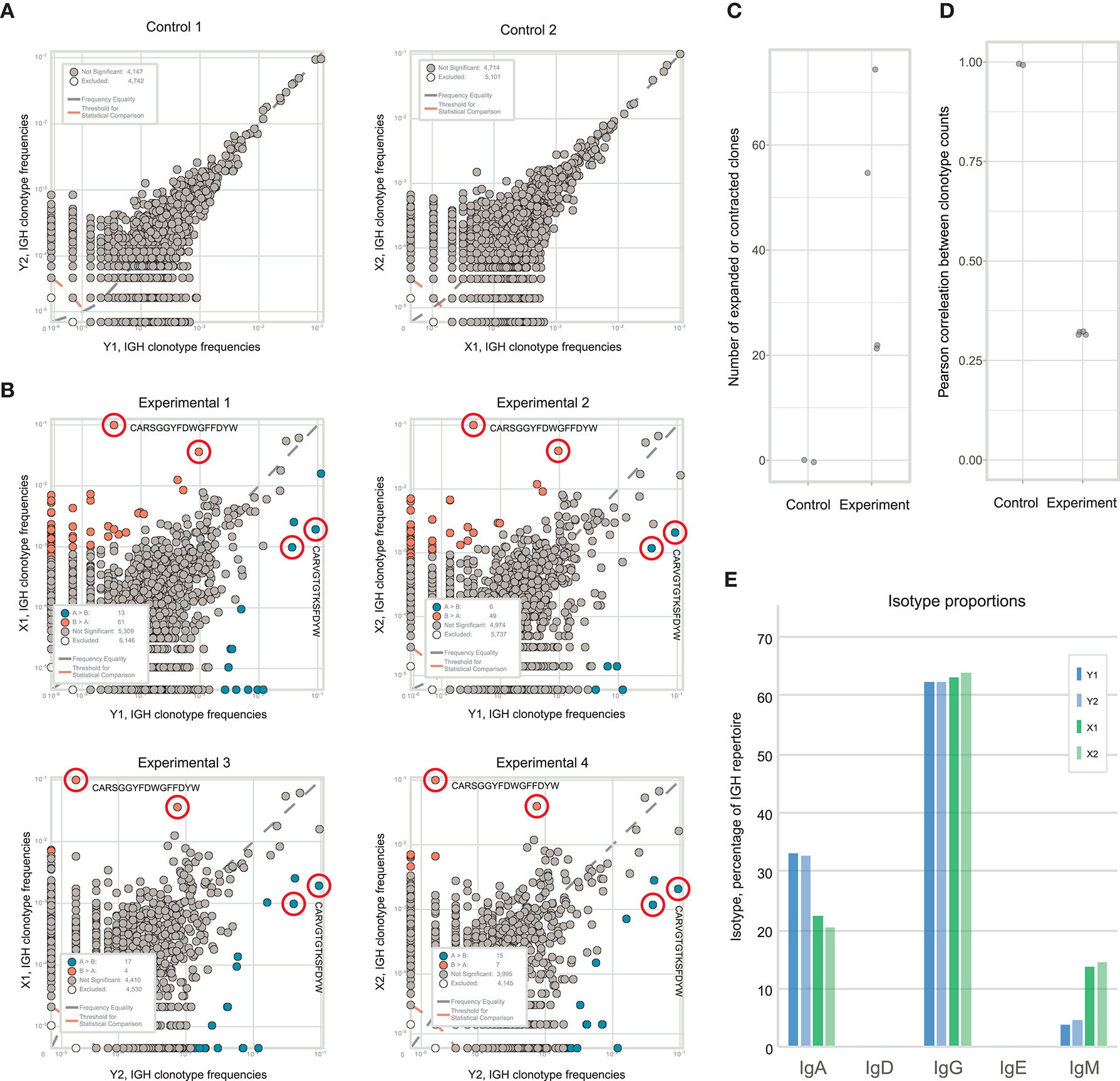 Estimating immunoglobulin repertoire heterogeneity between two sections of colon cancer tissue. (A) Frequencies of IGH CDR3 clonotypes in the Y1 and Y2 replicates, which were split at the level of homogenized cells. (B) Pairwise comparison of the four experimental repertoires obtained from two fragments and two replicates. (C) Frequencies of each IGH CDR3 clonotype in X1 and X2 replicates, which were split at the level of homogenized cells. Orange and blue circles show clonotypes that were erroneously identified as expanded between the two replicates, using a beta-binomial noise model trained on the replicates of fragment Y. (D) The number of expanded or contracted clones between control and experimental pairs of repertoires. (E) Pearson's r correlation between counts of clones present in each control and experimental pair of repertoires.
