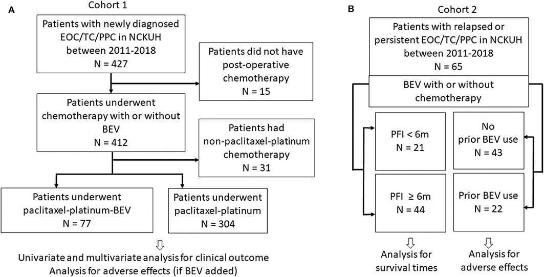 Figure 1. Study flow chart. (A) Cohort 1 patients underwent first-line paclitaxel-carboplatin chemotherapy with or without bevacizumab (BEV). (B) Cohort 2 patients with relapsed or persistent disease treated with BEV ± chemotherapy. Patients were also categorized as groups with progression-free interval (PFI) <6 and ≥6 m.