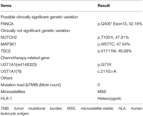 In January 2019, she developed gradually worsening upper abdominal pain, and then nausea and vomiting occurred. However, the results of gastroscopy and colonoscopy were normal. On April 4, positron emission tomography/computed tomography indicated probable tumor metastasis by detecting a solid mass in the bilateral accessory area (58 × 55 mm on the left side, 50 × 32 mm on the right side, maximum standard uptake value was 2.7–3.1), nodules in the posterior uterus and gallbladder fossa, and increased fluorodeoxyglucose (FDG) metabolism. Abdominal pelvic, peritoneal, and pleural effusions were also detected. There were nodules at the bottom of the gallbladder with increased FDG metabolism. FDG metabolism was increased in the residual stomach and ascending and descending colon. Next-generation sequencing suggested a germline FANCA mutation, microsatellite stability, mismatch repair, and low tumor mutational burden (Table 1). The tumor cells were PD-1 [–], PD-L1 [–], PMS-2 [+], MLH-1 [+], MSH-2 [+], and MSH-6 [+].
