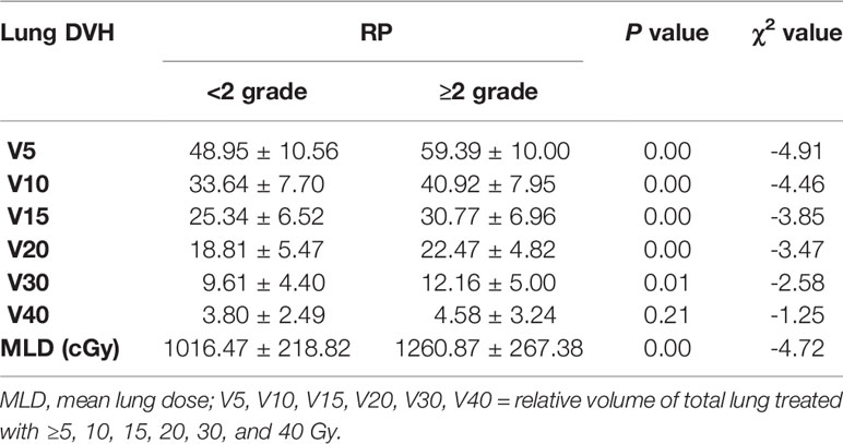 The 96 patients were divided into RP (39 cases) and non-RP (57 cases) groups, and 9 clinical features and 7 dosimetric parameters that might be related to the occurrence of RP were included. Univariate analysis showed that tumor stage was correlated with ≥2 grade RP (χ2 = 2.650, P = 0.008), and other factors, including age, sex, concurrent chemoradiotherapy or lack thereof, COPD status, smoking status, and RT dose, showed no significant differences between the two groups (all Ps > 0.05). V5, V10, V15, V20, V30, and MLD of both lungs were associated with the occurrence of grade ≥2 RP (all Ps < 0.05). The characteristics of the enrolled population are listed in Tables 1 and 2.