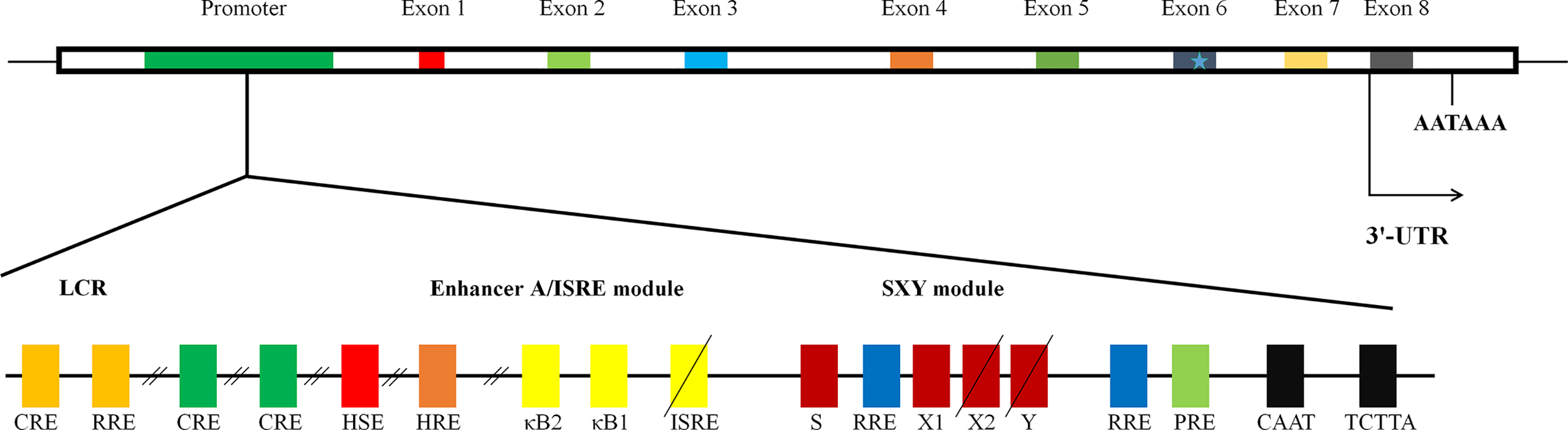 The structure of gene of HLA-G. The schematic diagram of HLA-G gene. It is composed of eight exons and seven introns. Many regulatory elements have been identified and characterized to regulate HLA-G expression. Three conserved cis-regulatory elements, enhancer A, the interferon-stimulated regulatory element (ISRE), and SXY module, mediating the transactivation of classical MHC class I genes; locus control region (LCR), located at least 1.2 kb upstream and crucial for spatio-temporal transcription; heat shock element (HSE), binding heat shock factor 1 in response to heat-shock or arsenate treatments; progesterone response element (PRE), mediating the up-regulation of HLA-G by progesterone during pregnancy; hypoxia response element (HRE), bound by hypoxia-inducible factor in response to hypoxia commonly observed in a majority of malignant tumors; three cAMP response elements (CRE), crucial for basal level of promoter activity of HLA-G; an additional functional ISRE, located at position −746 and capable of transactivating HLA-G following IFN-β treatment; three ras response elements (RREs), served as the binding site for transcriptional repressive factor RREB 1 (ras responsive element binding 1).