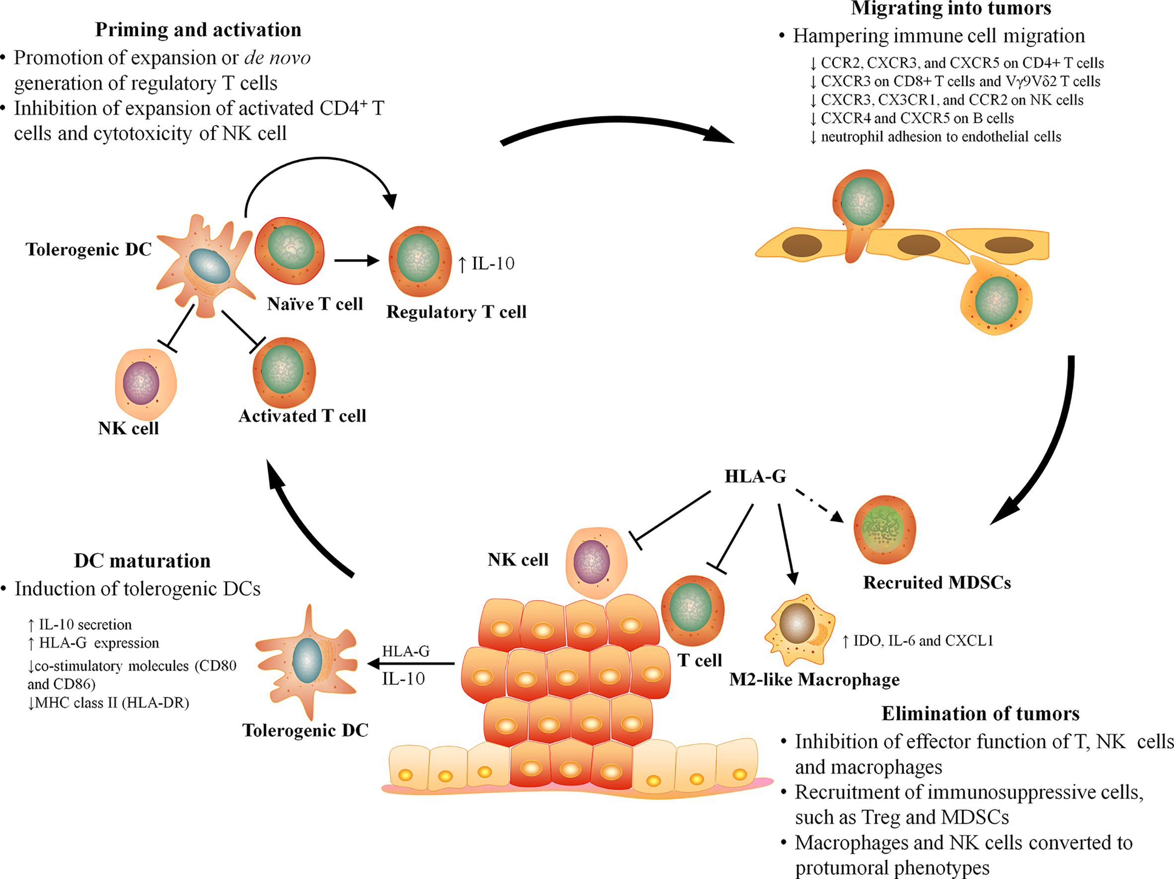 The effect of HLA-G on antitumor immunity. The antitumor immunity can be broadly divided into four major stages, DC maturation, T cell priming, leukocyte infiltration, and elimination. HLA-G can influence every stage of antitumor immune responses by inhibiting DC maturation, inducing T cell tolerance, hampering the migration of leukocyte, and suppressing the effector function and recruiting immunosuppressive cells at tumor sites.