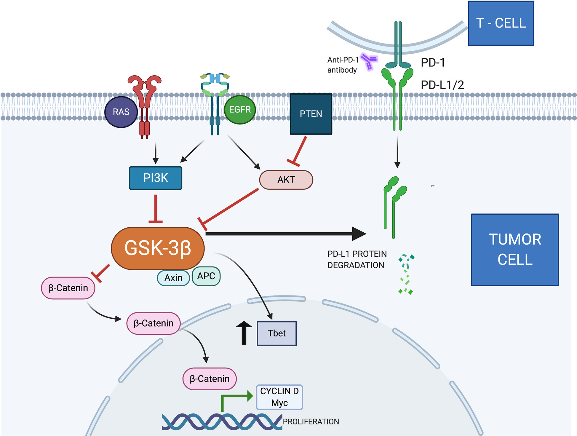 Several ligands on the cell surface stimulate the production of PIP3 (phosphatidylinositol trisphosphate) by PI3K. These molecules act as a substrate for protein activation, including AKT. This protein phosphorylates GSK3, inhibiting its function (6). The tumor suppressor gene PTEN blocks AKT activity by dephosphorylating PIP3 and PIK3 (21). In addition, Akt can activate the IκB complex (IKK), which phosphorylates IκB, becoming an important stimulus for NFκB (22). The NFkB is translocated to the nucleus, promoting the production of COX-2, an enzyme associated with angiogenesis, invasion, and metastasis (23). A complex consisting of AXIN, APC, and GSK3 is responsible for the destruction and negative regulation of B-catenin (24). The Wnt/β-catenin signaling pathway is related to cell proliferation, stem cell self-renewal, and cell differentiation (25). When active and in accumulation, B-catenin is translocated to the nucleus. Cyclin D1 and C-myc are oncogenes associated with cell proliferation and differentiation. Previous publications demonstrated they are target genes for the Wnt/B-catenin signaling pathway (26). T-box transcription factor protein 21 (TBX21)—also known as Tbet—is present in tumor cells, causing local immune response dysregulation and carcinogenesis (27). GSK3 inhibition promotes increased Tbet transcription (28). Previous reports demonstrated that GSK3 can cause PDL1 degradation by the proteasome pathway (29). GSK3, Glycogen Synthase Kinase-3; PI3K, Phosphatidylinositol-3-kinase; AKT, protein kinase B; MAPK, Mitogen-Activated Protein Kinase; APC, Adenomatous polyposis coli; Axin, Axis inhibitor; NFκB, Nuclear factor-κ light chain enhancer of activated B cells; PTEN, Phosphatase and tensin homolog; COX-2, Cyclooxygenase-2; EGFR, Epidermal growth factor receptor; MyC, Myelocytomatosis—proto oncogene; Tbet, transcription factor T-box expressed in T cells; RAS, Rat sarcoma—oncogene; PD-L1, Programmed death-ligand 1.