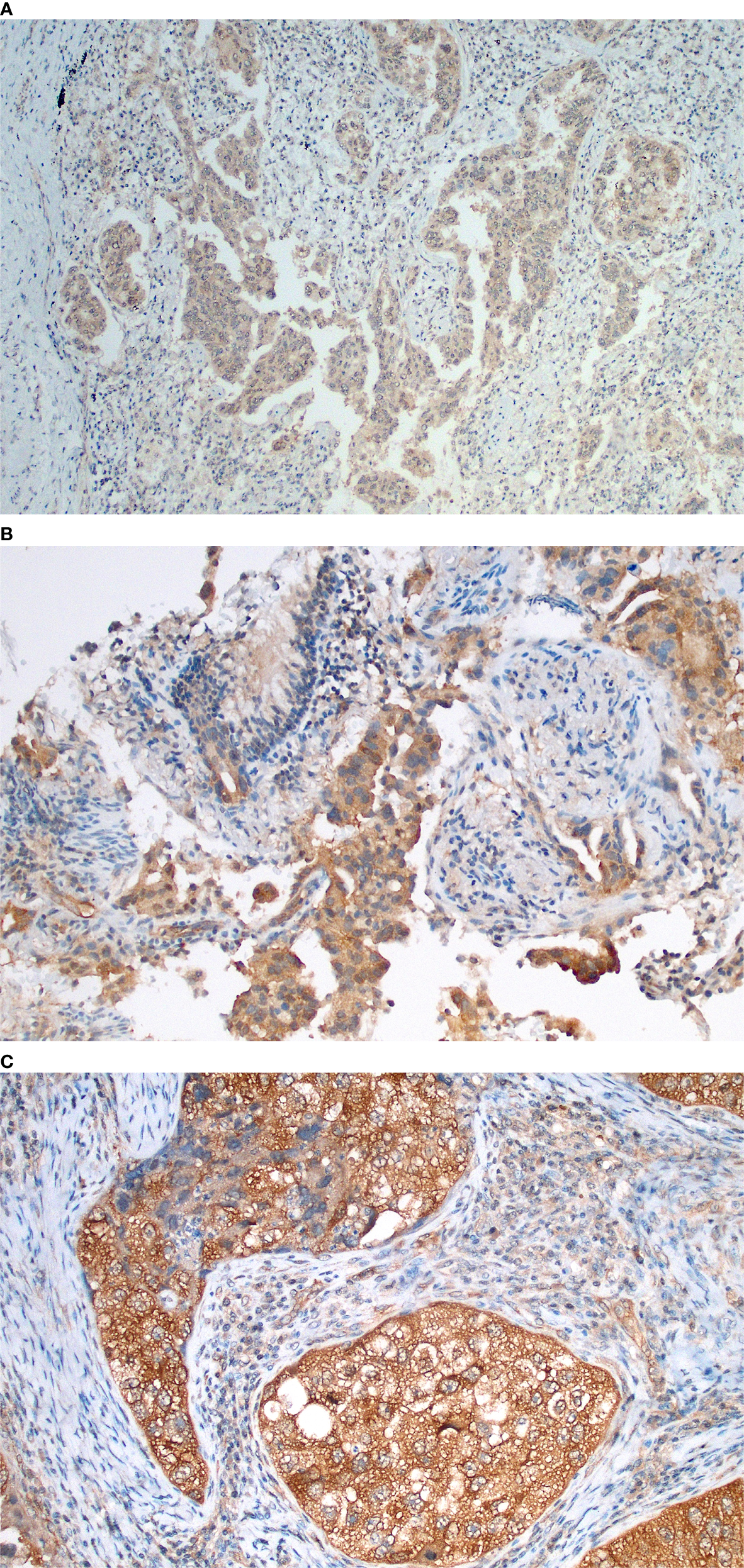 We sequentially selected 95 patients diagnosed with lung cancer between 2013 and 2019 in the State of Ceará, using available material (paraffin blocks) and follow-up information from an approximate cohort of 450 newly diagnosed patients from the same period. All patients had clinically and pathologically confirmed tumors as primary lung cancer. The Ethics Review Board reviewed and approved this research study. Cases were diagnosed by a single Thoracic Pathologist based on the current WHO criteria (31, 32).The inclusion criteria consisted of non-small cell lung cancer with enough tissue sample (paraffin blocks with tissue containing more than 100 tumor cells after all recuts) and availability for additional immunohistochemical studies. All patients with secondary tumors of the lung were excluded from the study. Epidemiology and clinicopathological characters (such as gender, age, smoking status, comorbidities, TNM stage, survival, molecular mutations) were obtained from medical records or by contacting the patients.