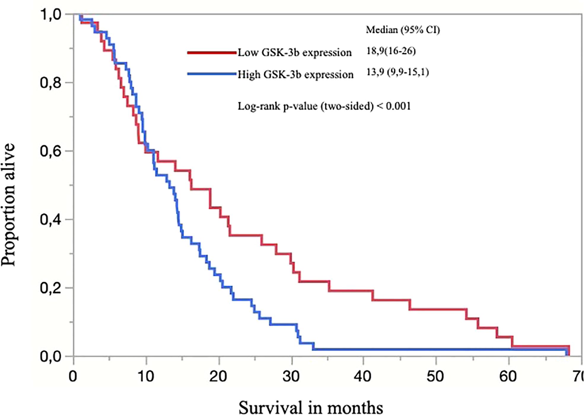 GSK-3ß was recorded according to the cytoplasmic and membranous staining intensity as 0 (negative), 1+(weak), 2+ (moderate), and 3+ (strong), and the percentage of stained tumor cells. A final histological score was established ([% of weak staining × 1] + [% of moderate staining × 2] + [% of strong staining × 3]) to determine the overall percentage of GSK-3ß positivity across the entire stained tumor sample, yielding a range from 0 to 300. Any tumor with a score >200 was considered as showing high GSK-3ß expression.