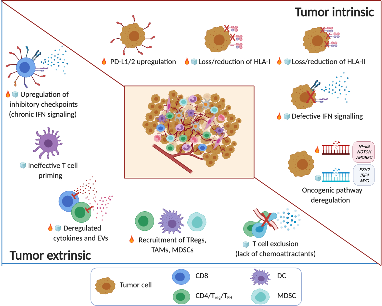 ) TMEs in B cell malignancy. The key factors that shape the TME include tumor immunogenicity, oncogenic pathways and genetic alterations that regulate T cell infiltration and function. Note: the timeline or sequence of events during the evolution of the altered pro-tumor, yet immunoprivileged TME is a current topic in the field. Emerging evidence from patients treated with immune checkpoint blockade drugs suggests that cancer immunoediting takes place not only during tumor progression but also in response to therapy (e.g. the acquisition of mutations that contribute to ‘defective IFN signaling’) (8–11). Several factors of immune escape and resistance to immunotherapy (innate or acquired) that have been characterized to date, can be broadly divided in tumor-intrinsic and tumor-extrinsic mechanisms. Tumor intrinsic mechanisms generally include genetic aberrations that can affect antigen recognition (‘loss/reduction of HLA-I/-II molecules’) (16, 115–119) and influence immune function (‘PD-L1/2 upregulation’) (120–122) and immune contexture in TMEs (‘oncogenic pathway deregulation’) including neoantigen load (83, 84). Tumor cell extrinsic factors that regulate anti-tumor immunity, immune evasion or resistance to immunotherapy involve non-tumor cellular and molecular components within the immune TME including ‘upregulation of inhibitory immune checkpoints’ (linked to chronic IFN signaling) (123–125), the ‘recruitment of TAMs, MDSCs, TRegs’ and stromal cells, as well as ‘deregulated cytokines and EVs’ (126–130), ‘ineffective T cell priming’ and ‘T cell exclusion’ (131–135). (Created with Biorender.com).