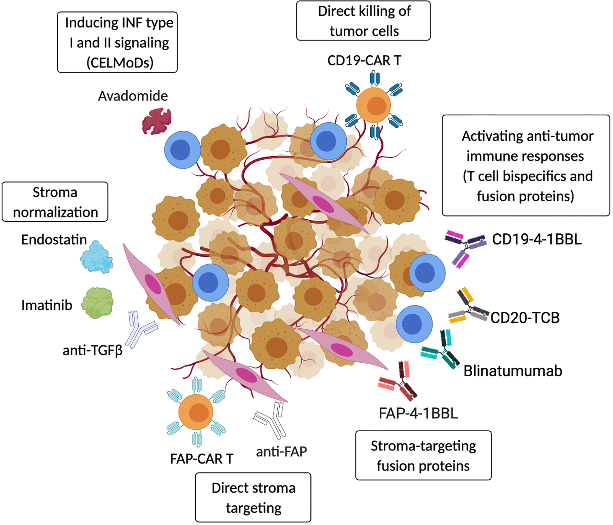 Targeting strategies to activate anti-tumor immunity in the TME. Therapeutic strategies include re-activation of autologous anti-tumor immune responses using CELMoDs (e.g. avadomide) (67) or T-cell bispecific antibodies and fusion proteins (CD20-TCB, CD19-4-1BBL, Blinatumumab) (279–282). Anti-tumor immunity can also be induced by transferring CAR-T/NK effector cells that directly target cancer cells (CD19-CAR-T) (283). In addition, cancer-associated stroma can be efficiently targeted to boost anti-tumor immunity, and fibroblasts-specific pharmacological approaches (anti-FAP antibodies or CAR-T) have been shown to induce tumor regression (284). Tumor stroma can also be ‘normalized’ by blocking or neutralizing cancer-secreted factors that promote stromal cell activation (Endostatin, Imatinib, anti-TGFβ) (285–287). Moreover, the presence of cancer-stroma-specific proteins can be used to activate tissue resident anti-tumor T cells using stroma-specific/T cells co-stimulatory fusion proteins (FAP-4-1BBL) (282). (Created with Biorender.com).