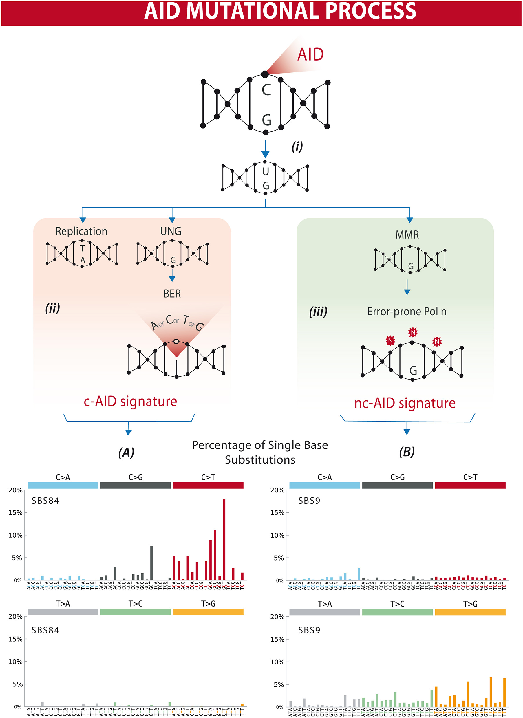 Differential processing of AID lesions. (i) AID deaminates cytosine residues on single-stranded DNA that is exposed during transcription, converting C (cytosine) into U (uracil). (ii) The U-G (guanine) mismatch can be processed through different pathways. Either by replication that will result in a C>T transition or by uracil DNA glycosylase (UNG) followed by base excision repair (BER) resulting in C>T/G/A substitutions or homologous repair. This will often result in a mutational profile known as canonical AID signature (c-AID). (iii) On the other hand, mismatch-repair proteins (MMR) can also recognize and process AID-induced lesions. Exonucleases resect the abasic sites, which are followed by error-prone polymerase repair. This processing often results in a mutational profile similar to the non-canonical AID signature. Lower panels (A,B) depict mutational profiles using the conventional 96 mutation type classification. This classification is based on the six substitution subtypes: C>A, C>G, C>T, T>A, T>C, and T>G (all substitutions are referred to by the pyrimidine of the mutated Watson–Crick base pair). Each of the substitutions is examined by incorporating information on the bases immediately 5′ and 3′ to each mutated base generating 96 possible mutation types (6 types of substitution × 4 types of 5′ base × 4 types of 3′ base). Mutational signatures are displayed and reported based on the observed trinucleotide frequency of the human genome, i.e., representing the relative proportions of mutations generated by each signature based on the actual trinucleotide frequencies of the reference human genome version GRCh37. (A) SBS84 is found in clustered mutations in the immunoglobulin gene and other regions in lymphoid cancers. (B) SBS9 may be due in part to mutations induced during replication by polymerase eta. Mutation frequencies were retrieved from the Comic Catalog v3.1 (cancer.sanger.ac.uk) (13).