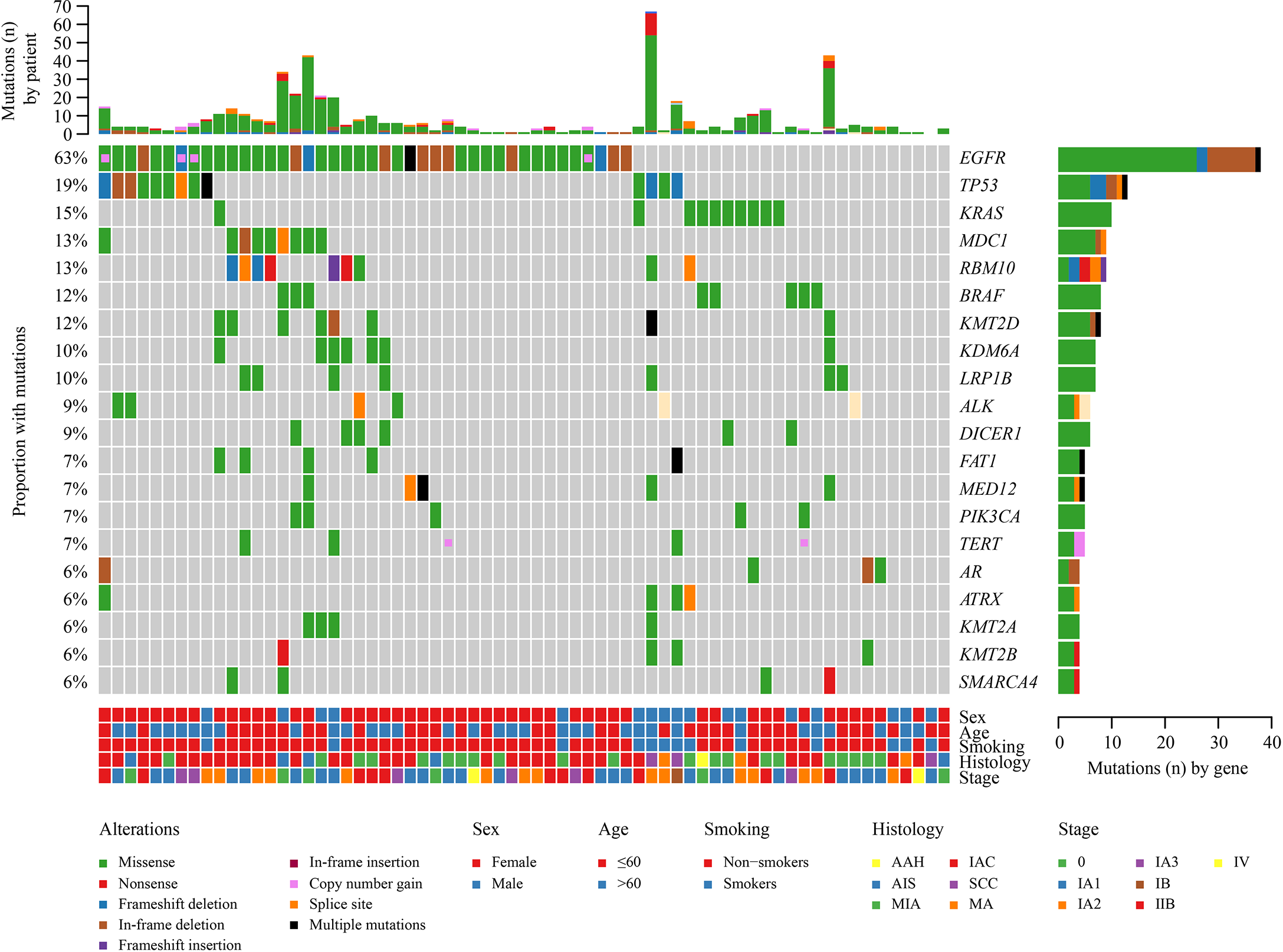 Landscape of genomic alterations in 67 multiple lung cancer samples. Genetic mutations were identified by targeted next-generation sequencing in the tumor tissues of the patients. The upper panel shows the numbers of non-synonymous single-nucleotide variants, small insertions or deletions, and copy number variants in each tumor. The heat map below shows the genes with somatic mutations sorted according to the mutation frequency. Clinical features are annotated in the lower panel.