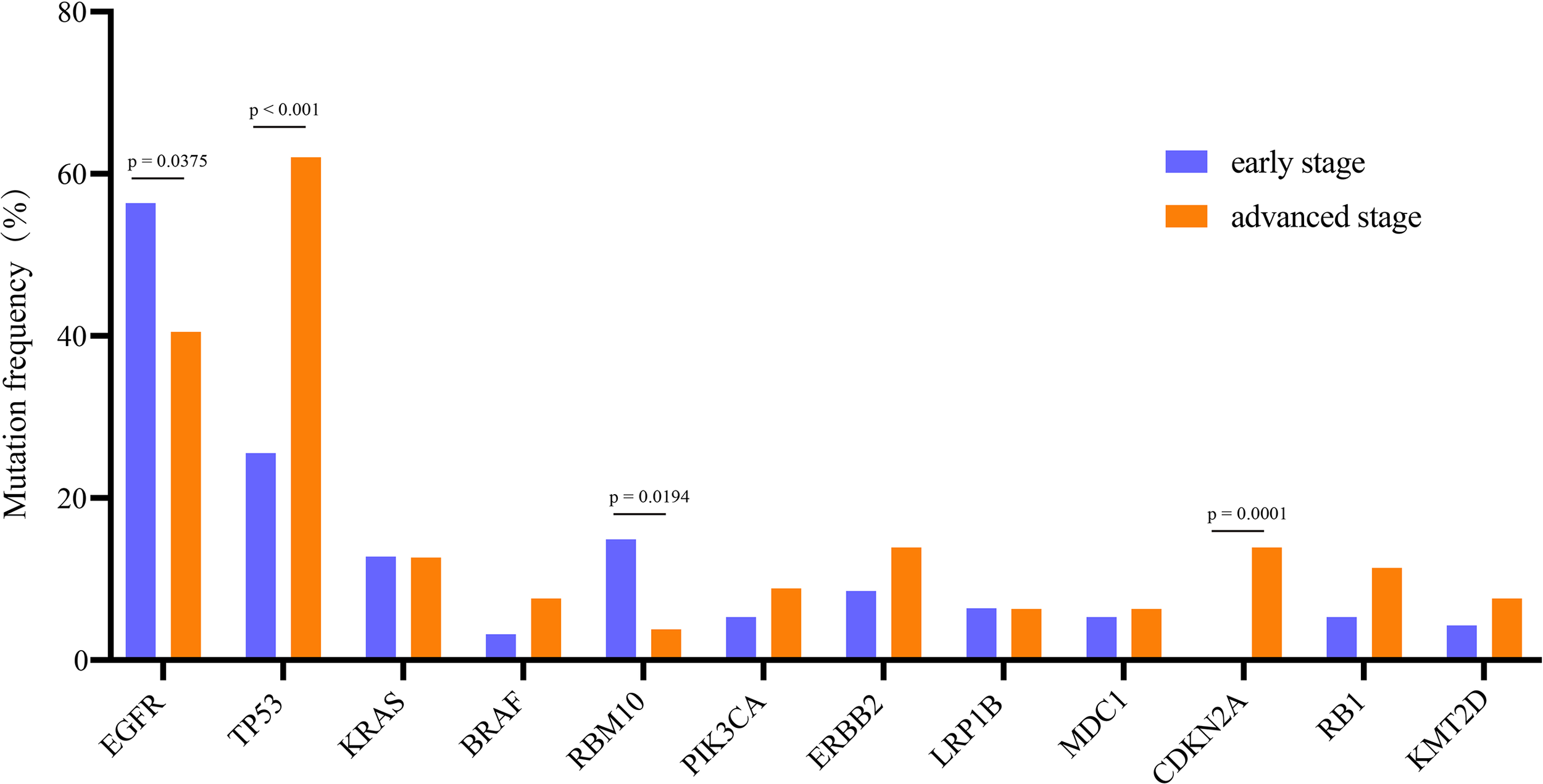 Comparison of the prevalence of frequently mutated genes in early stage and advanced-stage NSCLCs. The commonly mutated genes are arranged in order on the horizontal axis. The vertical axis represents the mutation frequency obtained from a different cohort.