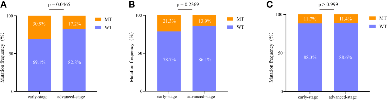 Comprehensive analysis of EGFR mutations in early stage and advanced-stage NSCLC. (A) Comparison of the difference in the EGFR L858R mutation between the two groups. (B) Comparison of the difference in the EGFR exon 19 deletion between the two groups. (C) Comparison of the difference in the other EGFR mutations (excluding EGFR L858R substitution and exon 19 deletion) between the two groups. 19del, exon 19 deletion; WT, wild type; MT, mutation type.