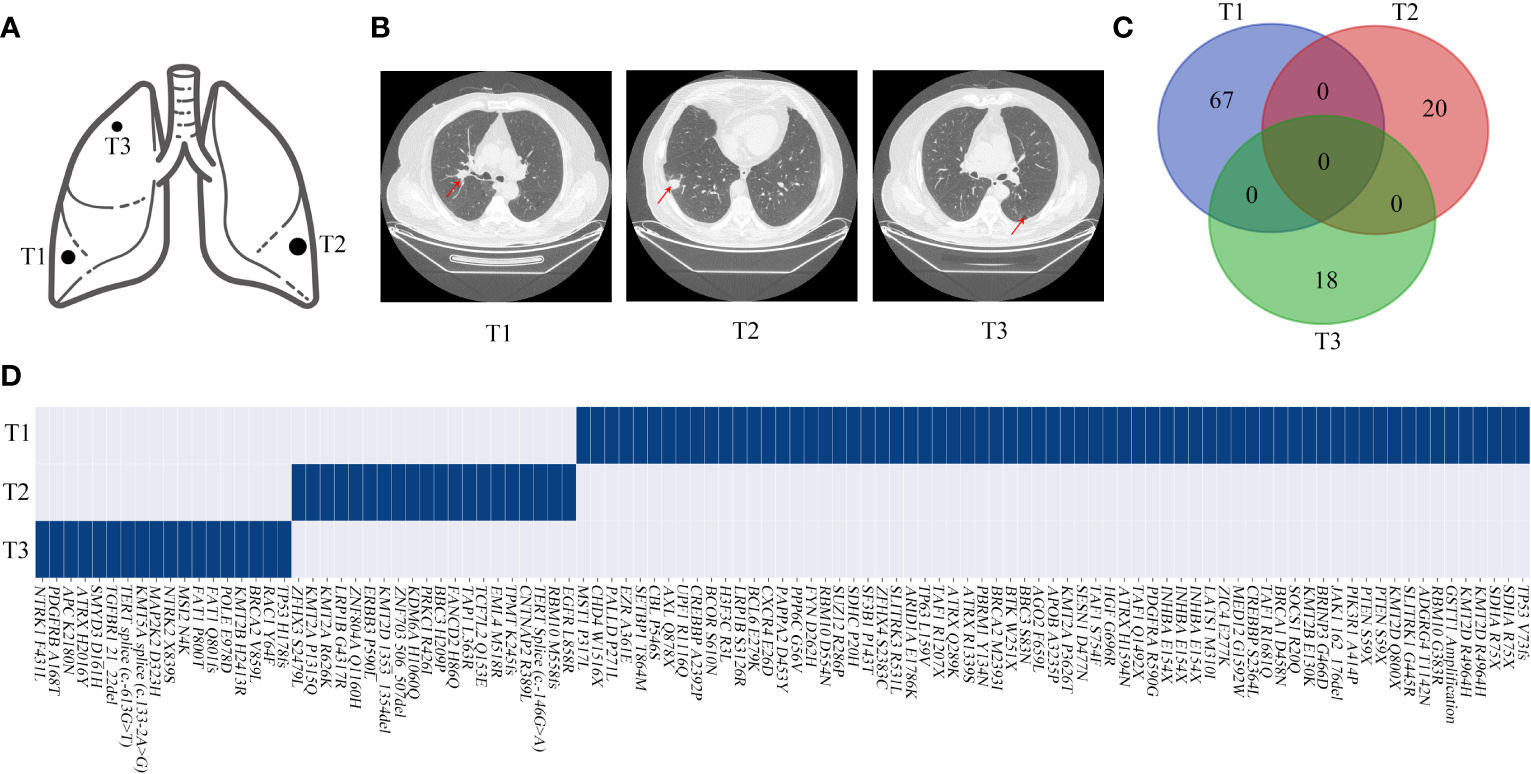 In 1975, Martini and Melamed proposed some criteria for differentiating multiple primary lung tumors from pulmonary metastatic tumors (8). However, this empirical classification does not include molecular analysis and cannot fully identify the link between multiple tumors. The histological characteristics of multiple tumors often overlap in lung cancer, especially in adenocarcinoma (9). Therefore, it is challenging to distinguish multiple primary tumors and multiple intrapulmonary metastases in the absence of molecular characteristics. Currently, intratumor heterogeneity is often interpreted using the trunk-branch model (10). In this model, trunk gene mutations drive tumor growth in each subcloning and tumor region. As the disease progresses, branch gene mutations occur heterogeneously in primary lesions and/or metastases and may induce intratumor heterogeneity. Based on this theory, lesions with multiple identical mutations could originate from the same clone. Numerous studies have shown that mutations in certain proto-oncogenes and cancer suppressor genes, such as EGFR, KRAS, and BRAF, can be used as molecular markers in multiple lung cancers (11, 12). However, only a few hotspot cancer driver gene mutations have been analyzed, and these mutation hotspots are not sufficiently reliable to analyze the differentiation of MPLC and intrapulmonary metastasis (IM).