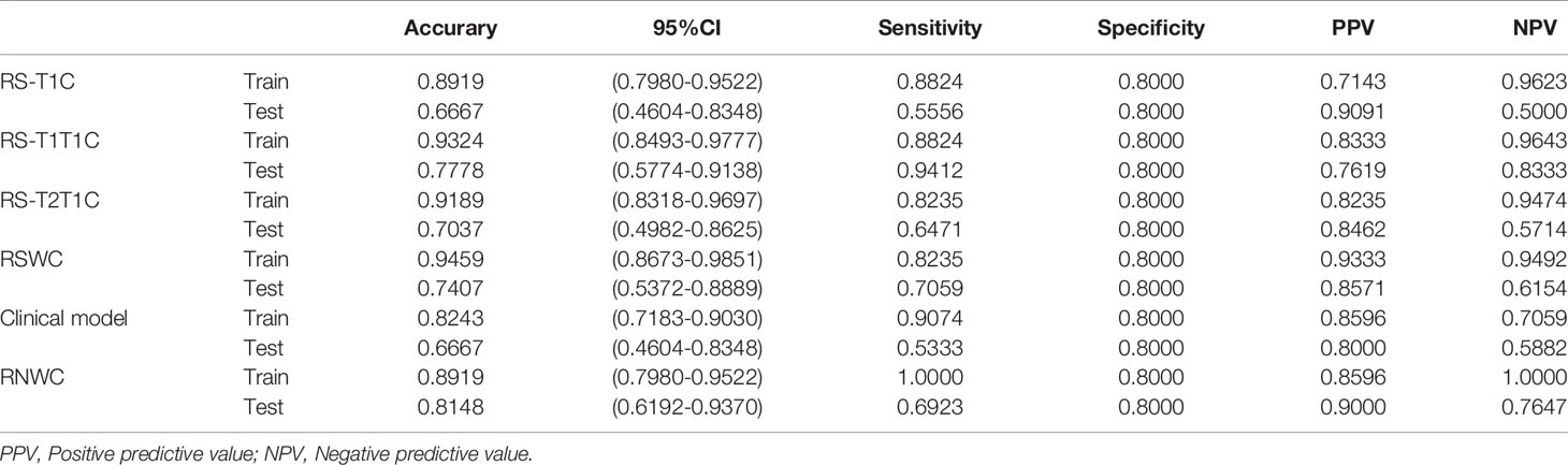 Results: The efficacy of the clinical model (AUC=0.81) of RNWC was higher than that of the model (AUC=0.76) of RNWOC in the test set. There was no significant difference in the AUC of radiomic algorithms in the test set. The RS-T1T2 (AUC=0.74) and RS-T1T2T1C (RSWC, AUC=0.81) achieved a good distinction efficacy in the test set. The RNWC and the RNWOC showed excellent distinction (AUC=0.89 and 0.82 respectively) in the test set. The DCA of the nomograms showed better clinical usefulness than the clinical models and radiomics signatures.