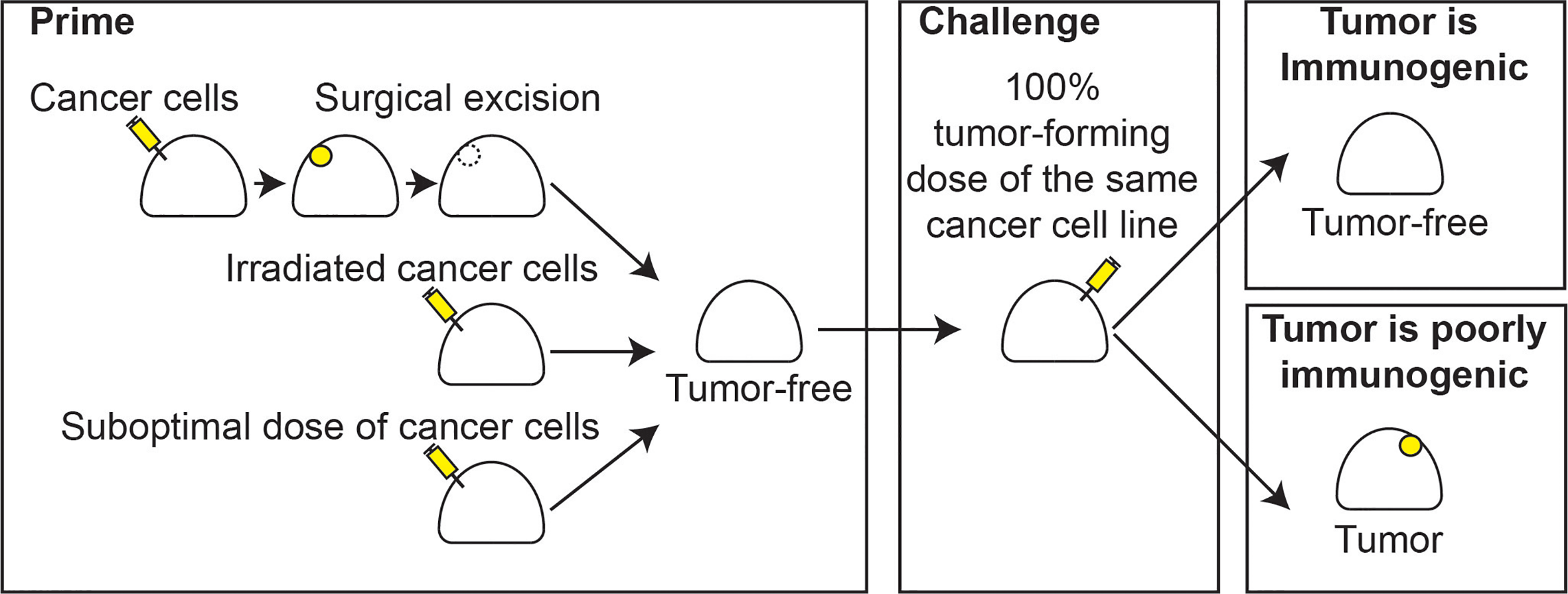 Classic immunogenicity. Classical models of immunogenicity involve a priming step with either injection of a bolus of cancer cells followed by complete surgical resection, injection of irradiated cancer cells, or a suboptimal number of cancer cells that fails to induce tumor formation (left), leaving a tumor-free animal. A challenge step follows, whereby an optimal dose of cancer cells, which would otherwise result in 100% tumor formation in naïve animals, is injected into the animal (center). The animal is followed and if the tumor is rejected, the tumor cells are immunogenic (right, top). If a tumor forms, the cells are poorly immunogenic (right, bottom).