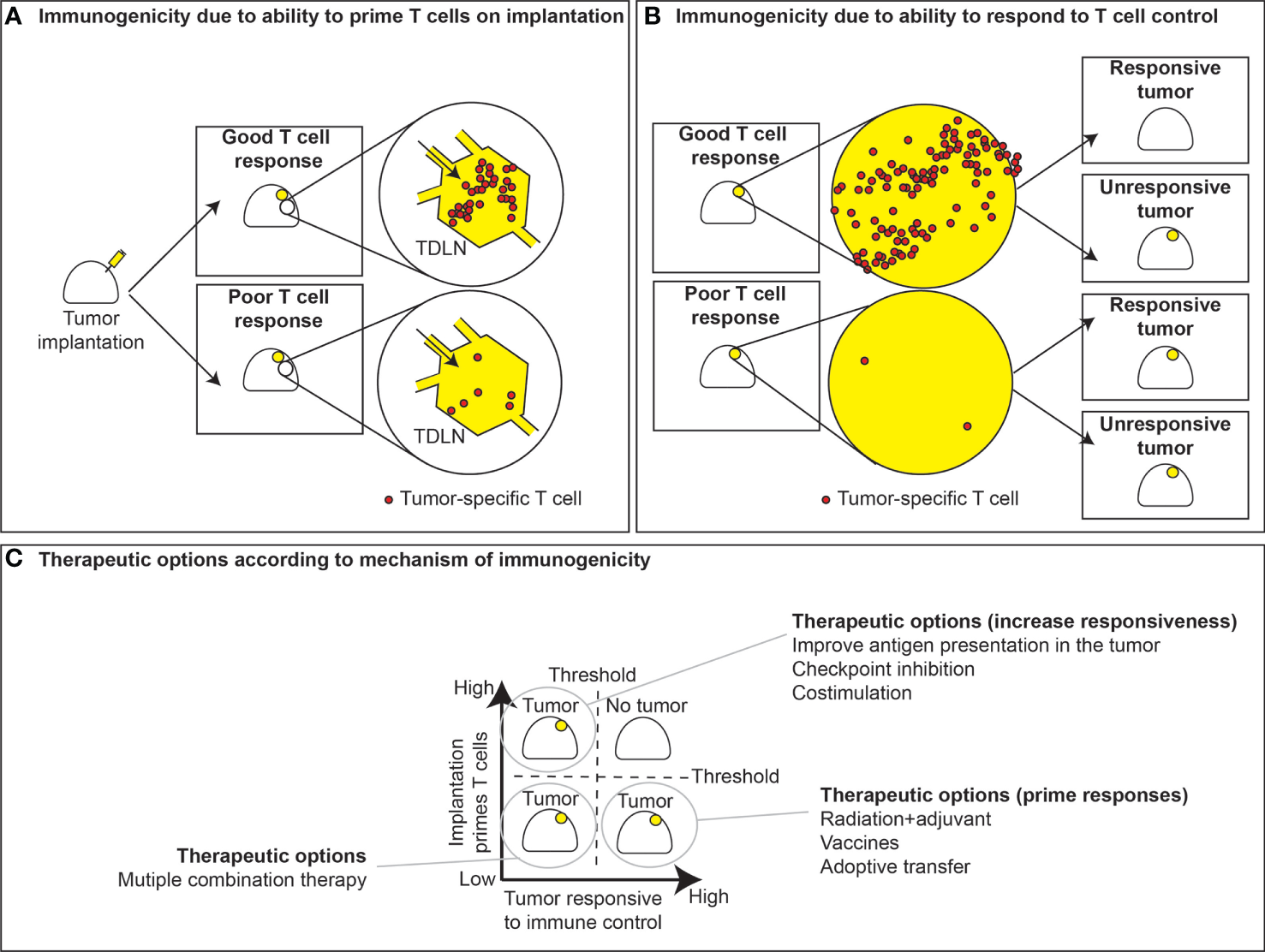 T cell priming versus responsiveness. (A) Immunogenic tumors with sufficient antigens and priming elicit good T cell responses in the tumor draining lymph node, while poorly immunogenic tumors fail to generate T cell responses. The ability of tumors to respond to T cell control is not necessarily linked to their ability to prime T cell responses. (B) In instances where priming occurs, tumors can either respond to tumor control or fail to respond. Conversely, tumors can either be responsive or unresponsive to T cell control, despite a lack of T cell priming. (C) This dichotomy leads to strategies for therapeutic interventions based of whether T cell priming occurs and whether tumors are responsive to immune control. In the case where priming fails yet tumors are prone to immune control, effective strategies may include vaccines or radiation to boost priming or instead ex vivo expansion and adoptive transfer of tumor-specific T cells. Alternatively, in tumors where T cells are primed but fail to exert immune control, therapeutic options may include checkpoint inhibitors, costimulation, or therapies that may improve immune recognition. Instances where both priming and responsiveness are low, tumors may require multiple therapeutic modalities to improve outcomes.