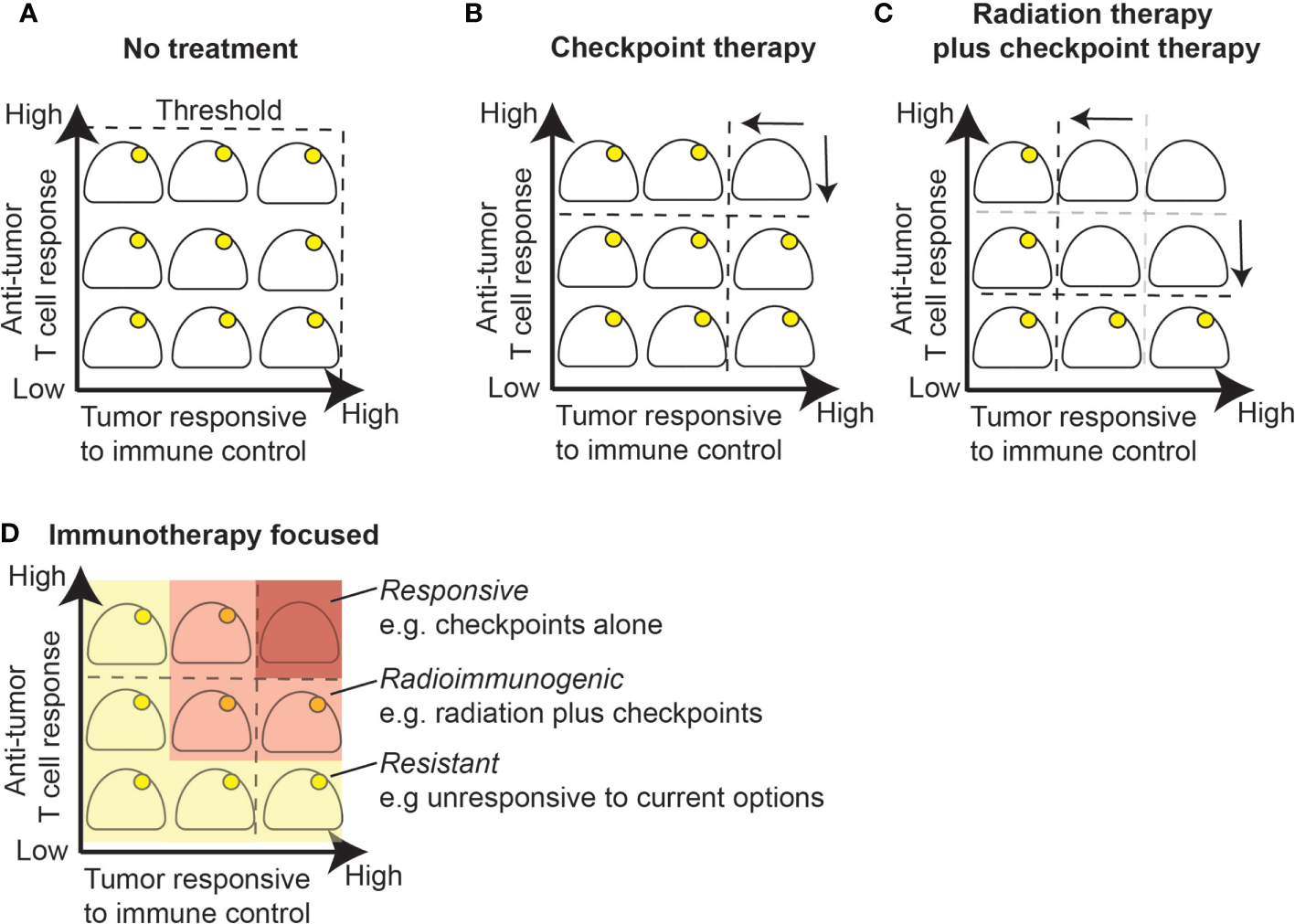 Radiation alters the response threshold to immunotherapy. (A) Growing tumors are by definition below the immune control response threshold since a lack of treatment will ultimately be lethal. (B) Checkpoint inhibition alone will result in cure for a portion of tumors that have an established T cell response and are responsive to immune control. (C) Radiation therapy boosts T cell responses by priming or boosting T cell responses and improves response to immune control within the treatment field due to increased antigen presentation or other inflammatory effects. (D) Immunotherapy changes the response threshold while radiation further changes the response threshold in radioimmunogenic tumors. A portion of remaining tumors fail to respond well to checkpoint inhibition with or without radiation therapy and will require additional therapeutic modalities that target additional resistance mechanisms.