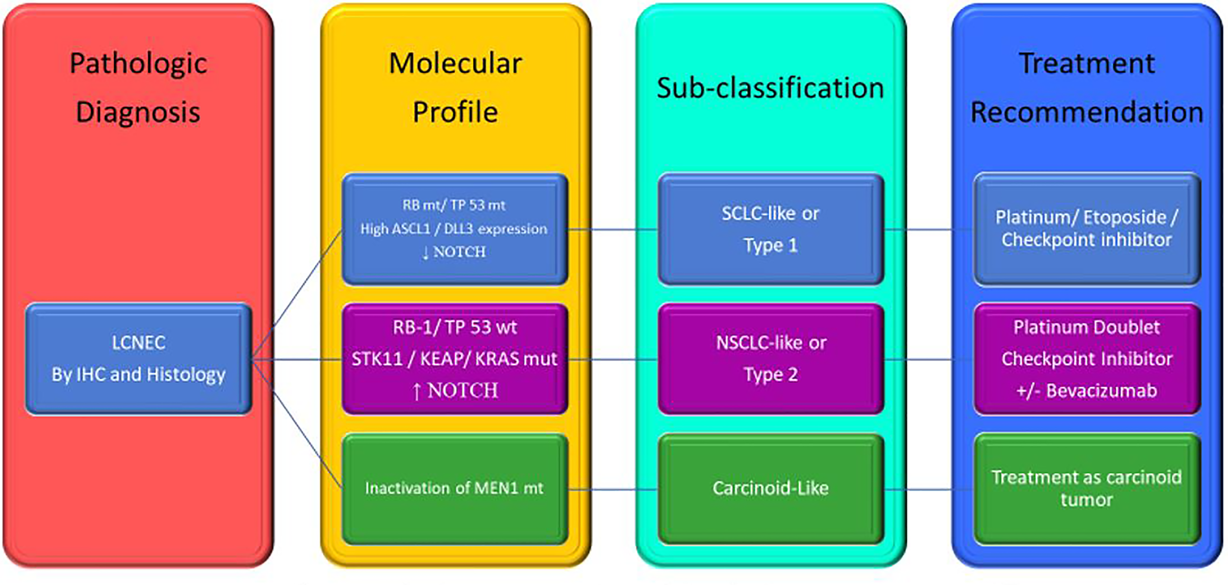 Based on this information, it seems rational to start separating LCNEC based on genomic profile and classify them as SCLC-subtype, NSCLC-subtype, Carcinoid-subtype, and choose the regimen based on their genomic profile. See Figure 2.