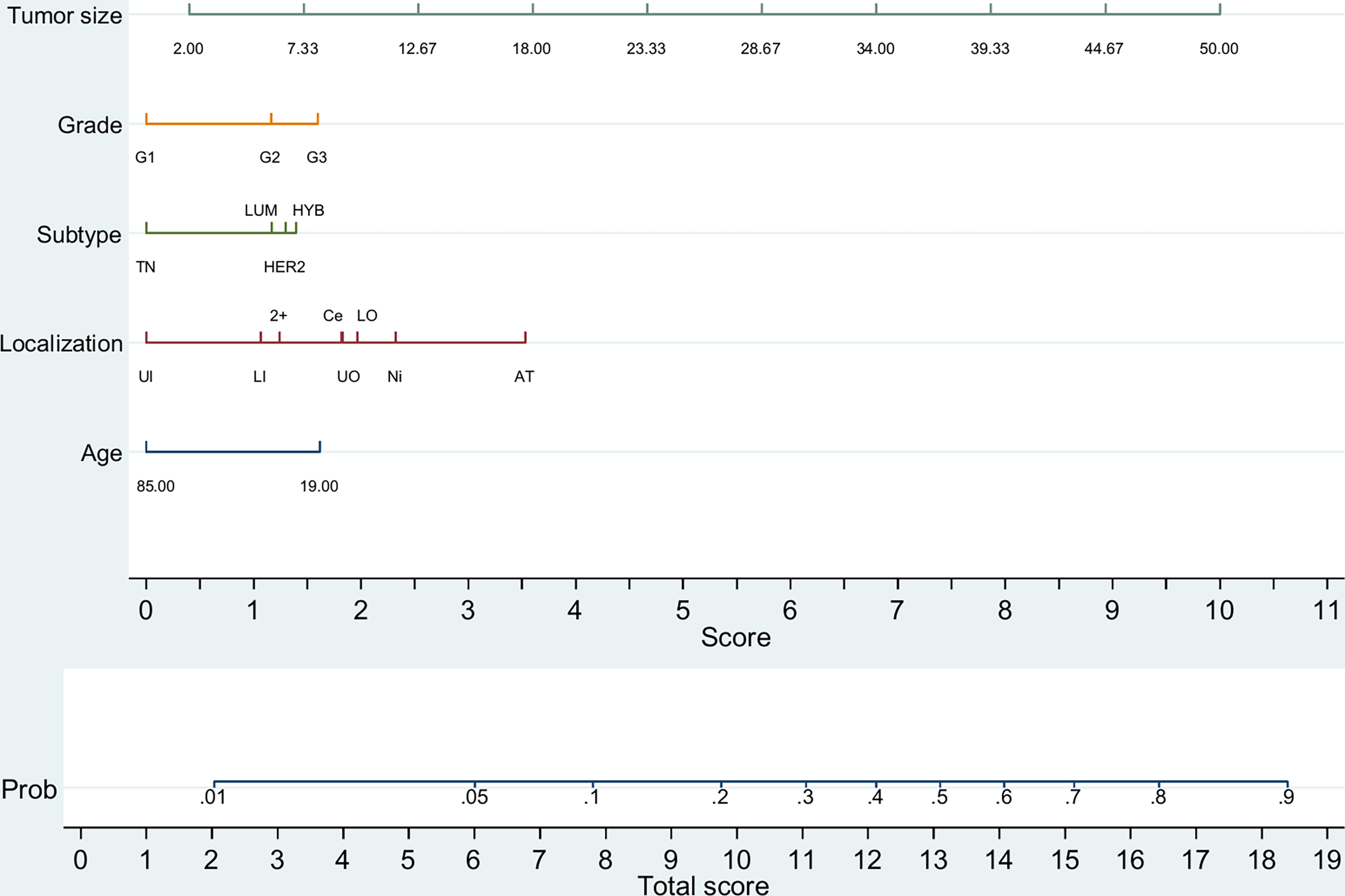 We performed a SEER-based study with breast invasive ductal carcinoma patients treated between 2010 and 2015. Optimal cutoffs of positive LNs predictive of survival were obtained with ROC curves and survival as a continuous variable. Bias was reduced through propensity score matching. Cox regression was employed to estimate prognosis. Nomograms were constructed to analyze the predictive value of clinicopathological factors for axillary burden.