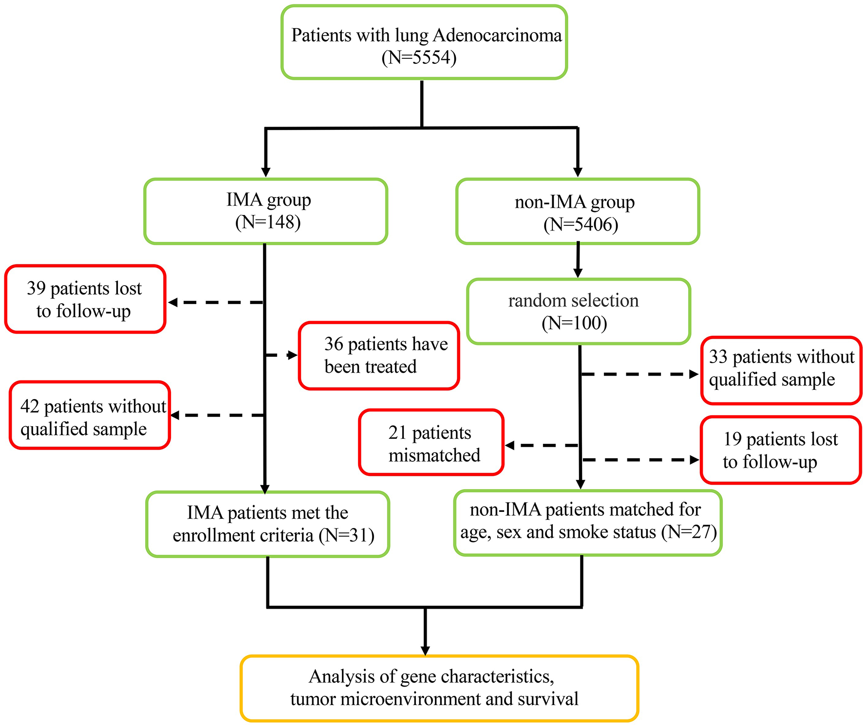 A total of 9,260 patients with lung cancer were reviewed; only 148 patients with lung IMA were confirmed from January 2010 to December 2015 at Zhejiang Cancer Hospital. IMA patients who satisfied all of the following criteria were enrolled: (1) All collected tumor samples must be pathologically diagnosed as IMA; (2) All patients had complete clinical and follow-up information; (3) All patients did not receive any anti-tumor treatment; and (4) All patients signed informed consent. As a control group, NSCLC patients with non-IMA were also included. The clinical characteristics of the participants are listed in Table 1. The study was conducted in accordance with the ethical standards of the Ethics Committee of Zhejiang Cancer Hospital, and informed consent for the use of tumor specimens was obtained.