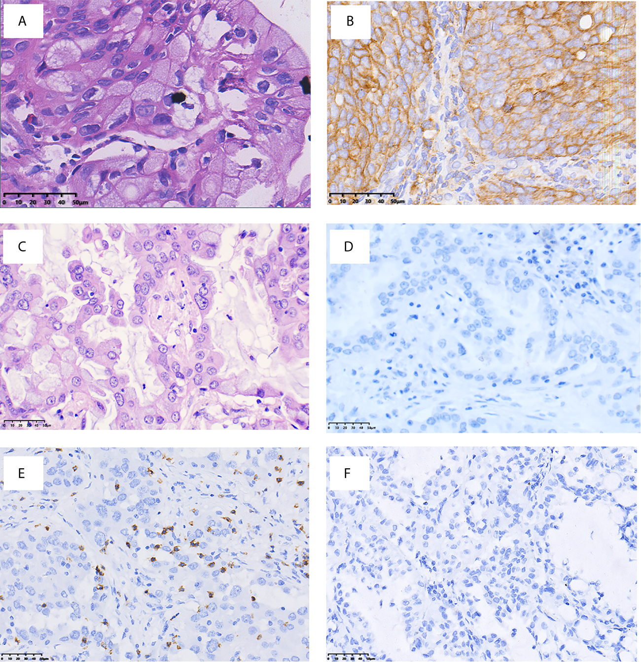 Representative images of PD-L1 and CD8 immuno-staining (×400 original magnification). H&E (A) and PD-L1 (B) staining of patients with PD-L1+; H&E (C) and PD-L1 (D) staining of patients with PD-L1−; (E) presence of CD8+ TILs; and (F) absence of CD8 + TILs.