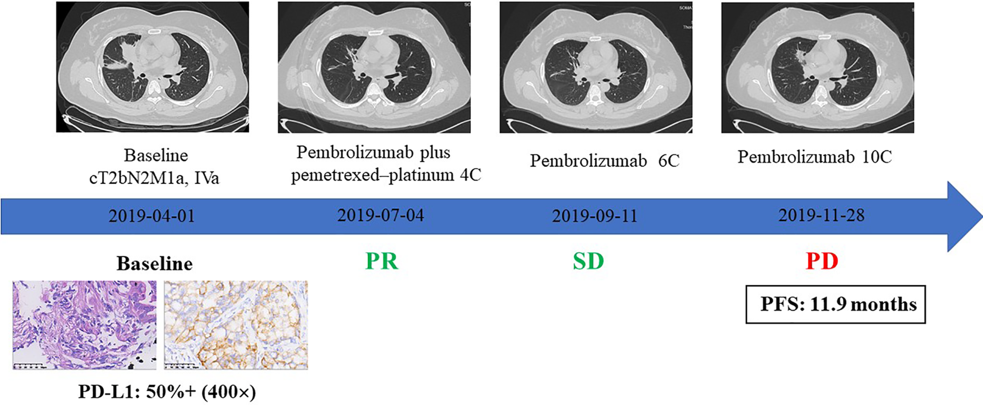 To evaluate the clinical efficacy of checkmate inhibitor based on TME status, we collected clinical data of a patient with IMA of the lung who was treated with PD-1 inhibitors. As shown in Figure 4, the patient was a 32-year-old young woman with lung ADC with pleural metastases (cT2bN2M1a, stage IVA). The IHC of her biopsy sample showed positive PD-L1 expression (50%) and strong CD8+ staining (40%). After four cycles of pembrolizumab plus pemetrexed–platinum regimen, the patient exhibited partial response (PR), with obviously shrunken pulmonary lesions (Figure 4). This patient then continued to receive pembrolizumab monotherapy and experienced a disease stabilization. Ultimately, after six cycles of pembrolizumab monotherapy, the patient developed disease progression due to a relapse with lung lesions; PFS was of 11.9 months.