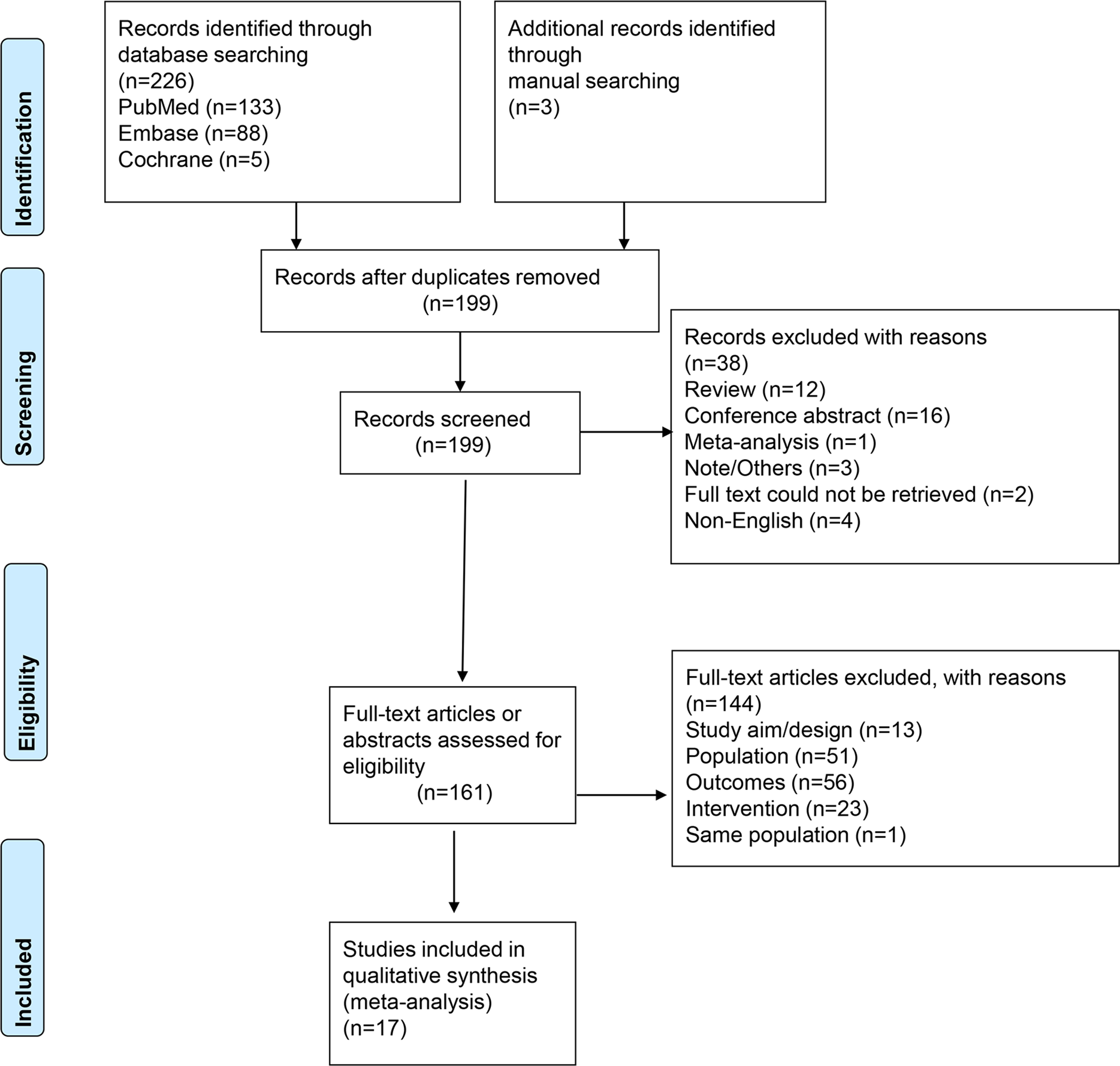 Figure 1 presents the study selection process. The initial search yielded 229 records; after removing the duplicates, 199 were screened, and 38 were excluded. Then, 161 full-text articles or abstracts were assessed for eligibility, and 144 were excluded: 13 for study design/aim, 51 for the population, 56 for the outcomes, 23 for the intervention, and one for the language. Finally, 17 studies were included in this meta-analysis. Supplementary Table S2 presents the excluded studies.