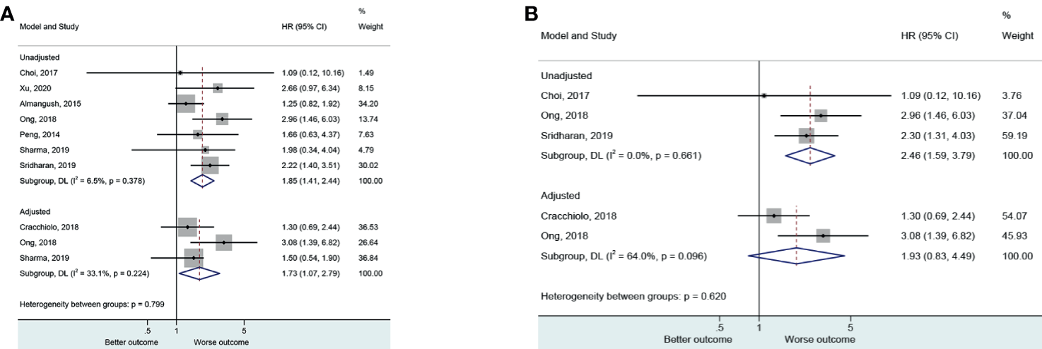 (A) Forest plot for locoregional recurrence (local and regional) according to the applied model (adjusted and unadjusted). (B) Forest plot local recurrence according to the applied model (adjusted and unadjusted).