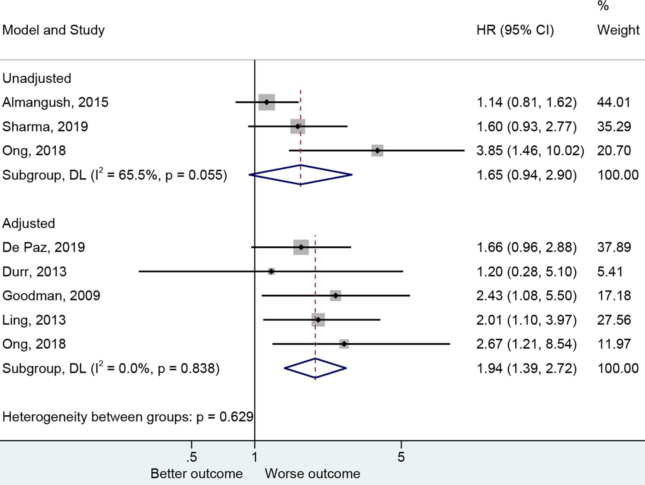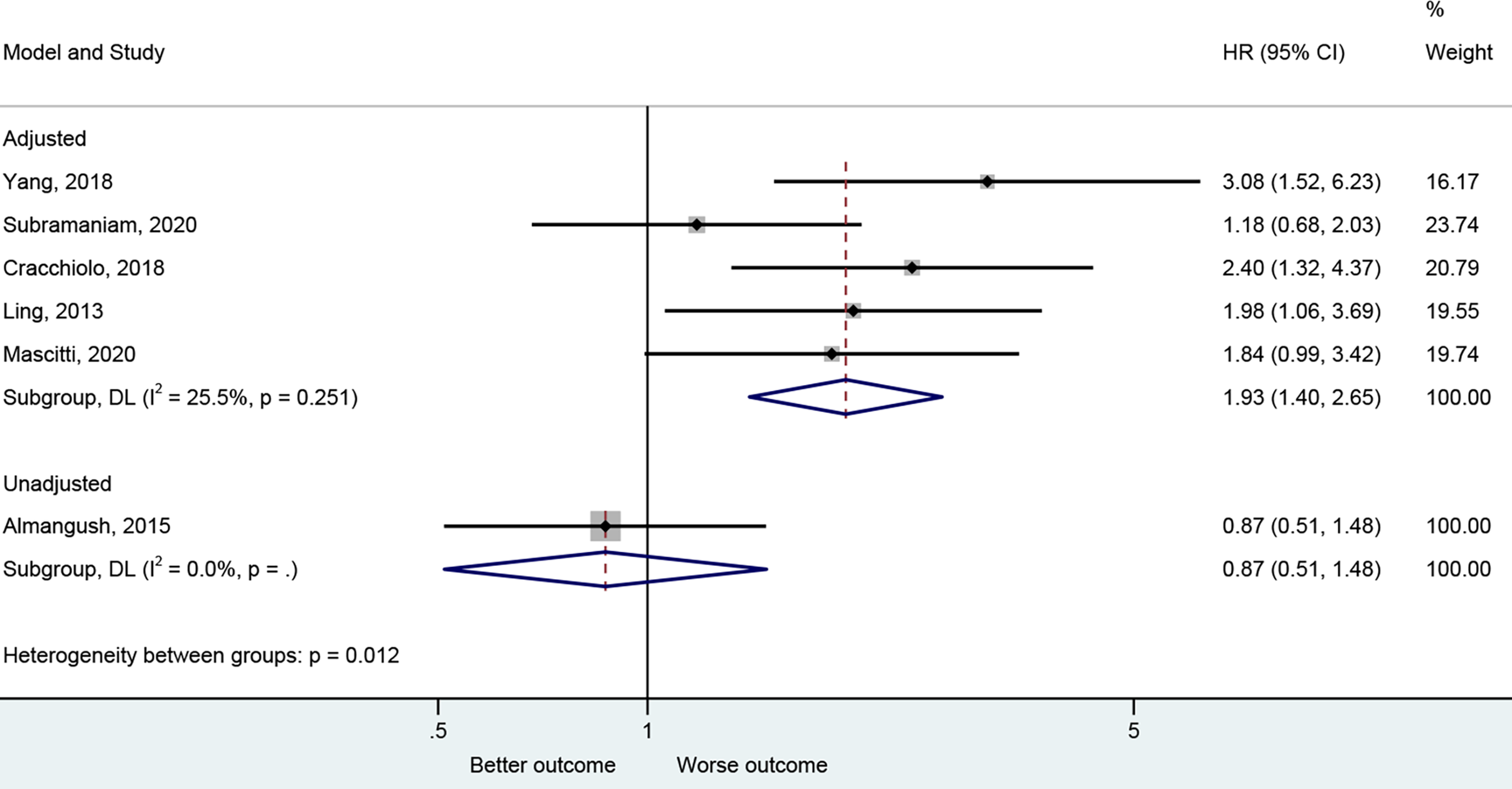 Forest plot for overall survival by the applied model (adjusted and unadjusted).