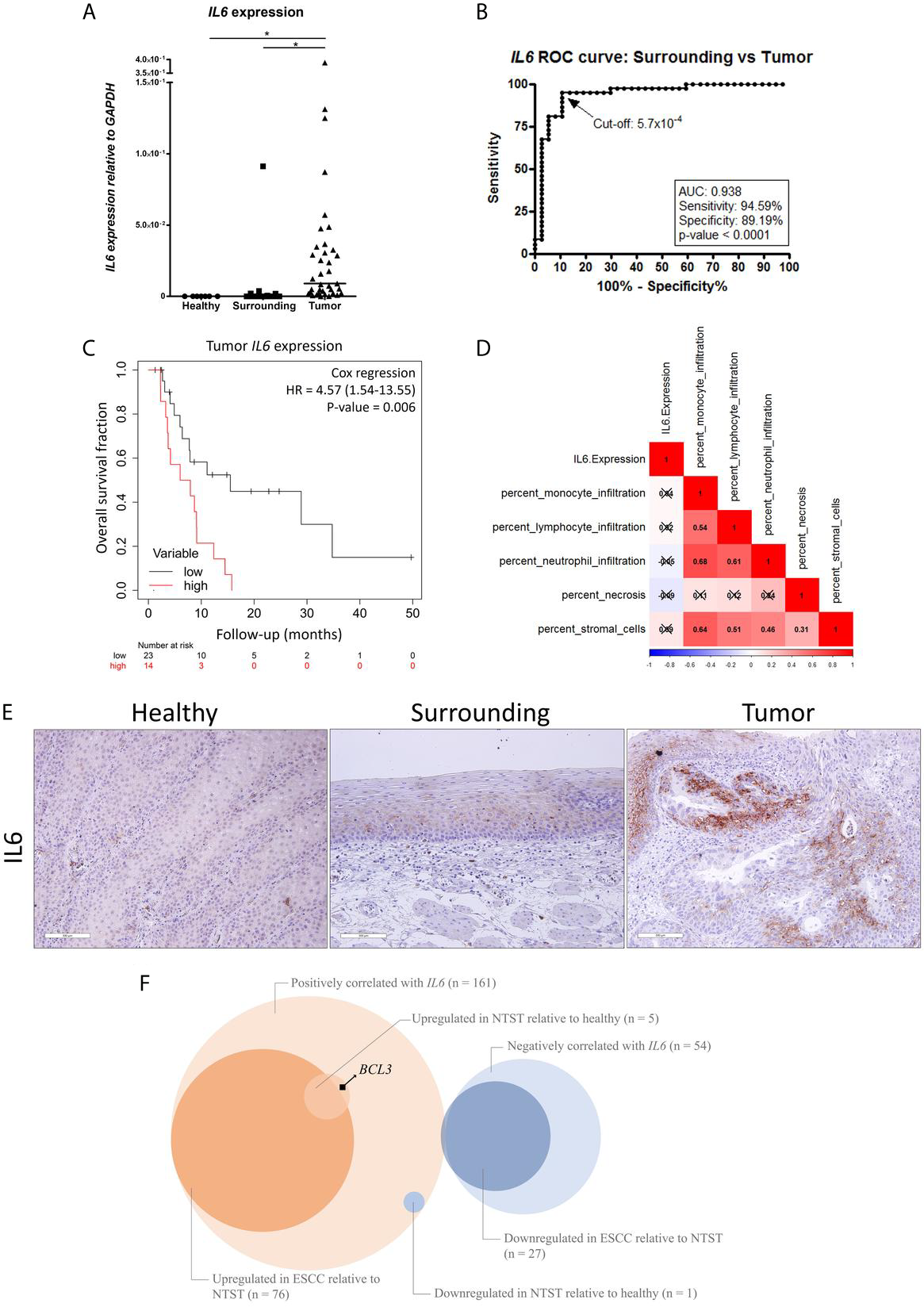 Figure 1 IL6 dysregulation in ESCC. (A) Dot-plot representing IL6 mRNA expression normalized with GAPDH in esophageal mucosa from individuals without esophageal disorders (Healthy), histologically normal tumor-surrounding tissues from ESCC patients (Surrounding), and ESCC (Tumor). (B) Receiver Operating Characteristic (ROC) curve showing the sensitivity and specificity of IL6 mRNA expression normalized with GAPDH to distinguish Surrounding and Tumor samples from ESCC patients. IL6 expression cut-off of 5.7x10-4 showed the highest accuracy (93%), sensitivity (95%) and specificity (89%) (p < 0.0001). (C) Kaplan-Meier curve showing the overall survival of ESCC patients according to IL6 expression. High expression was defined as ≥ 2.53x10-2 GAPDH units, according to the best performing threshold. Tumor stage was used for adjustment. (D) Correlation matrix between IL6 expression and the percentage of different cellular populations in ESCC samples from the TCGA database. Red represents positive correlations, and blue represents inverse correlations. Boxes marked with an X depict non-significant correlations (p ≥ 0.05). (E) Representative FFPE slides from immunohistochemistry performed with IL6 antibody in esophageal mucosa from individuals without esophageal disorders (Healthy), histologically normal tumor-surrounding tissues from ESCC patients (Surrounding), and ESCC (Tumor). Sections were counterstained with Harris’ hematoxylin. All images are shown in 20X magnification and 300 µm scale bars are shown. (F) Venn diagram showing the number of genes whose mRNA expression was positively or negatively correlated with IL6 mRNA expression (q-value < 0.05) in ESCC samples from TCGA database, number of genes upregulated or downregulated in ESCC relative to non-tumor surrounding tissue (NSTS) (|fold-change| > 1.5 and FDR < 0.05) in our dataset, and number of genes upregulated or downregulated in NTST relative to healthy esophageal mucosa (|fold-change| > 1.5 and FDR < 0.05) in our dataset. BCL3 is highlighted as a gene whose mRNA expression was positively correlated with IL6 expression in ESCC, and that was found upregulated in NTST relative to the healthy esophagus. *p < 0.05.