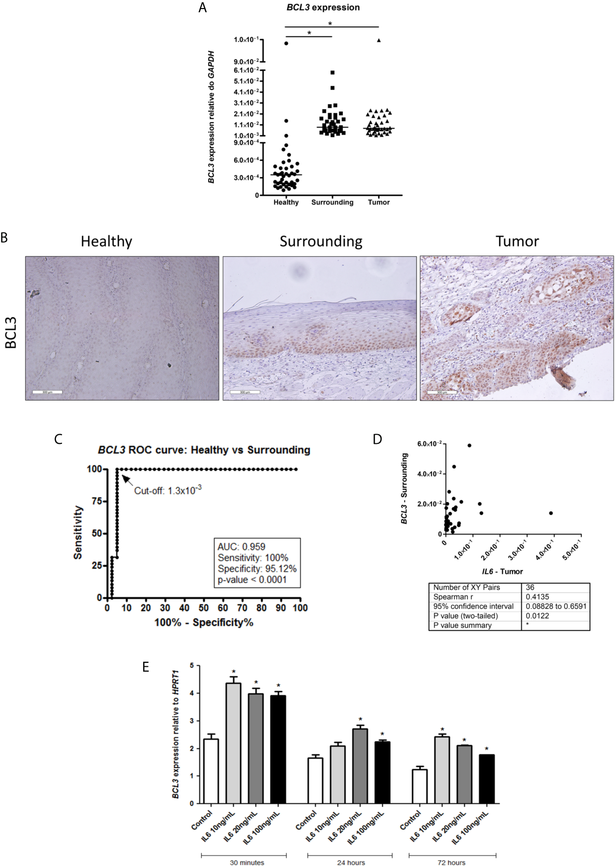 Figure 2 BCL3 expression in healthy esophagus and ESCC. (A) Dot-plot representing BCL3 mRNA expression normalized with GAPDH in esophageal mucosa from individuals without esophageal disorders (Healthy), histologically normal tumor-surrounding tissues from ESCC patients (Surrounding), and ESCC (Tumor). (B) Representative FFPE slides from immunohistochemistry performed with BCL3 antibody in esophageal mucosa from individuals without esophageal disorders (Healthy), histologically normal tumor-surrounding tissues from ESCC patients (Surrounding), and ESCC (Tumor). Sections were counterstained with Harris’ hematoxylin. All images are shown in 20X magnification and 300 µm scale bars are shown. (C) Receiver Operating Characteristic (ROC) curve showing the sensitivity and specificity of BCL3 mRNA expression normalized with GAPDH to distinguish Healthy from Surrounding. BCL3 expression cut-off of 1.3x10-3 showed the highest accuracy (95.89%), sensitivity (100%) and specificity (95.12%) (p < 0.0001). (D) Correlation analysis between IL6 expression in tumor samples (X-axis) and BCL3 expression in the non-tumor surrounding tissue (Y-axis) from the same patient. Each dot represents an ESCC patient. (E) Bar graphs showing BCL3 mRNA expression normalized with HPRT1 in HET-1A esophageal cells after IL6 treatment in different doses for different periods of time. *p < 0.05.