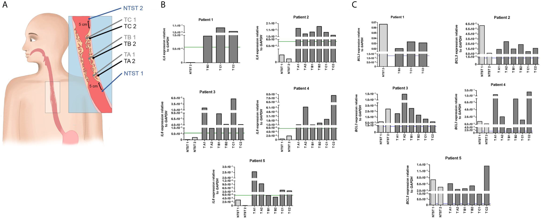 Figure 3 Intratumor heterogeneity of IL6 and BCL3 expression in ESCC. (A) Schematic representation of sample collection by endoscopy for the evaluation of intratumor heterogeneity. From each patient, a total of eight biopsies was collected when possible. Non-tumor surrounding tissue samples were collected 5 cm below (NTST 1) and above (NIST 2) the tumor border. ESCC samples were collected from each third of the tumor mass (lower third, TA; middle third, TB; and upper third, TC), being one superficial (1) and another profound (2), the latter collected by a biopsy-on-biopsy scheme. (B) Bar graphs representing IL6 expression normalized with GAPDH in the different non-tumor surrounding tissue (NTST) and tumor biopsies from five patients diagnosed with ESCC (Patient 1-5). The green line represents the IL6 expression cut-off that showed the highest accuracy to differentiate the tumor tissue from the non-tumor surrounding tissue, as shown in Figure 1B (5.7x10-4). (C) Bar graphs representing BCL3 expression normalized with GAPDH in the different non-tumor surrounding tissue (NTST) and tumor biopsies from five patients diagnosed with ESCC (Patient 1-5). The blue line represents the BCL3 expression cut-off that showed the highest accuracy to differentiate the non-tumor surrounding tissue from the esophageal mucosa from individuals without esophageal disorders, as shown in Figure 2C (1.3x10-3).