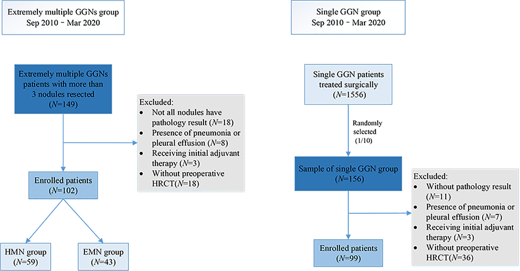 From September 2010 to March 2020, 1,556 patients with single GGNs and 149 patients with extremely multiple GGNs underwent surgery in our center. A total of 156 of the 1,556 (one out of 10) patients with single GGNs were randomly selected as the sample to match the number of patients with extremely multiple nodules in a ratio of 1:1. The data of the 156 patients with single GGNs and all the patients with extremely multiple GGNs was collected. The inclusion criteria for the single nodule (SN) group were as follows: (i) only one GGN was found on preoperative imaging and (ii) the GGN diameter was between 3 and 30 mm. The inclusion criteria for the extremely multiple nodules group were as follows: (i) number of GGNs ≥3, (ii) GGN diameter between 3 and 30 mm, and (iii) no less than three nodules were surgically removed and pathologically diagnosed. The patients in the extremely multiple nodules group were divided into two subgroups according to the number of nodules: the exceedingly multiple nodules (EMN) group (>10) and the highly multiple nodules (HMN) group (three to 10) (Figure 1). The primary nodule in the group with extremely multiple GGNs was defined as the main tumor to be surgically resected as decided upon by the surgeons, which primarily depended upon its radiologic invasiveness, the percentage of solid components, and the tumor size. All patients were regularly evaluated by HRCT scans from the day of surgery; the intervals were at the discretion of the attending physician. Generally, the patients were reviewed every 3 months within 2 years after surgery, every 6 months starting in the third year, and annually starting in the fifth year. The components of the follow-up review included chest CT, abdominal ultrasound and tumor markers, and brain magnetic resonance imaging. Whole-body bone scan imaging was considered according to the condition of the patient.