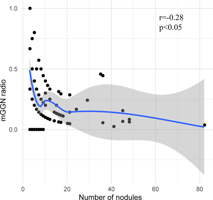 Ground-glass nodules (GGNs) are nonspecific radiologic findings showing hazy opacity, without blocking the underlying pulmonary vessels or bronchial structures, on high-resolution computed tomography (HRCT) (1) and are classified as either pure ground-glass nodules (pGGNs) or mixed ground-glass nodules (mGGNs) according to the absence or presence of solid components. The pathology of GGNs can be malignant or benign and be associated with conditions such as inflammation, focal interstitial fibrosis, and hemorrhage (2).