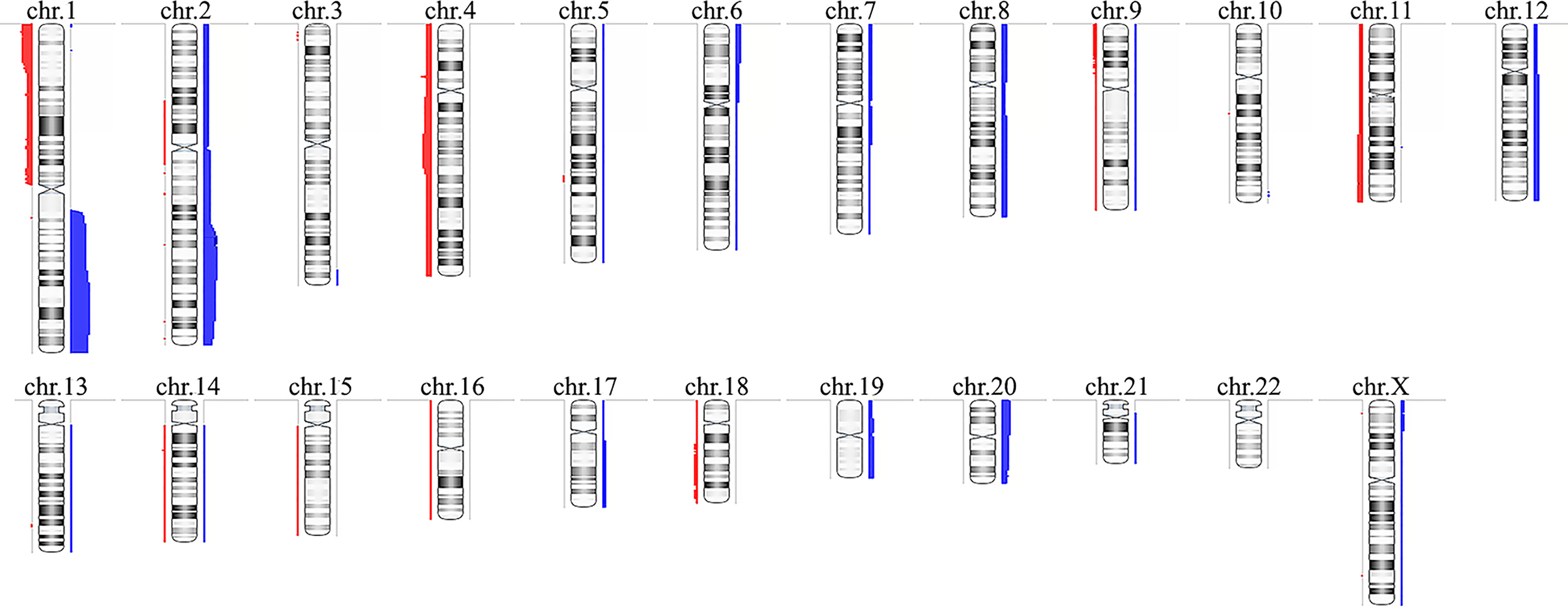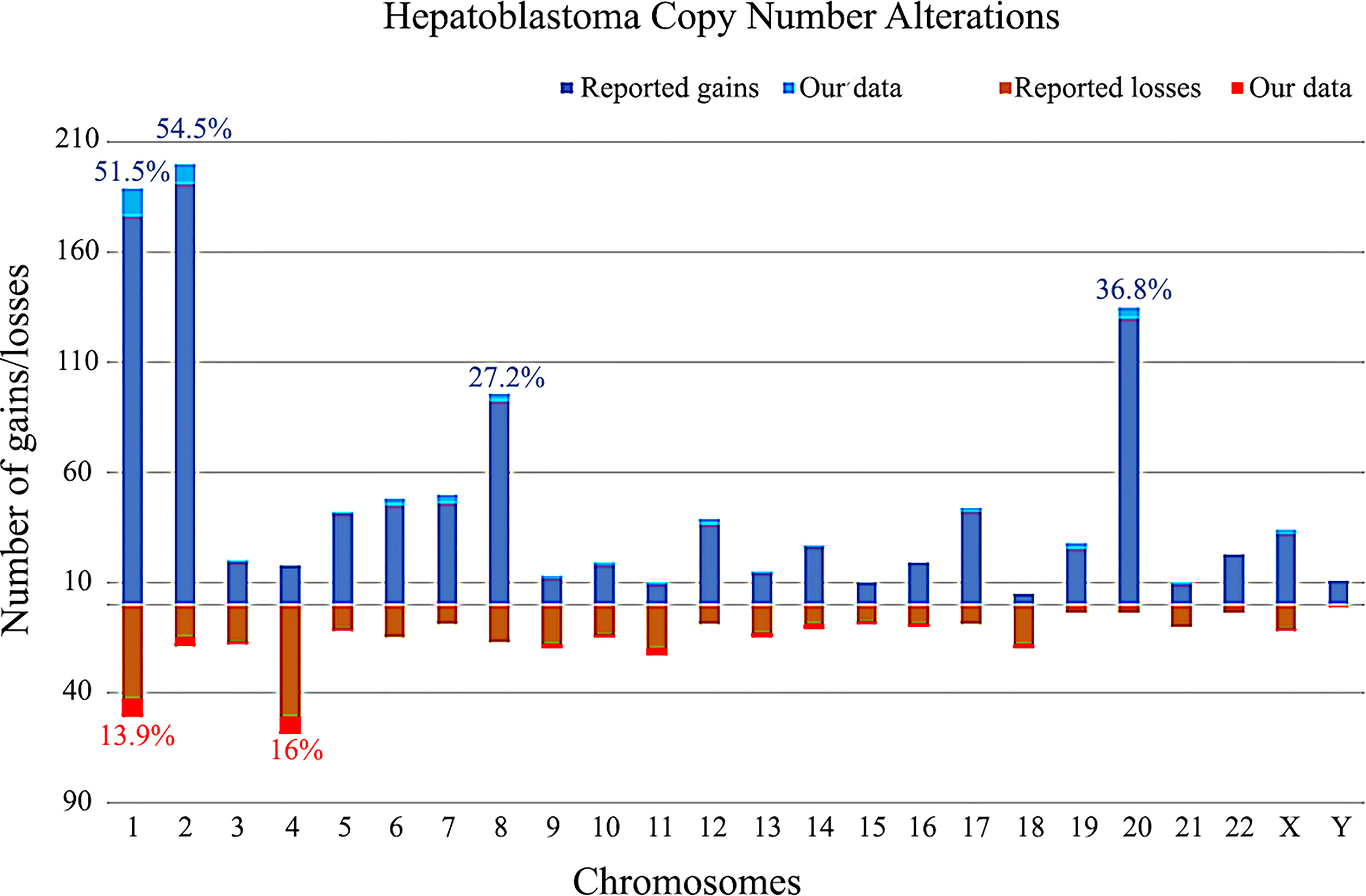 Copy number alterations profile of the Brazilian hepatoblastoma cohort investigated by chromosomal microarray analysis using aCGH. Ideograms of chromosomes are depicted with copy number gains represented in blue bars at right, and losses in red at left; the width of the bars indicates the frequency of the alteration in the entire group. Chromosome Y was not evaluated. Image generated using the software Nexus Copy Number 9.0 (BioDiscovery).