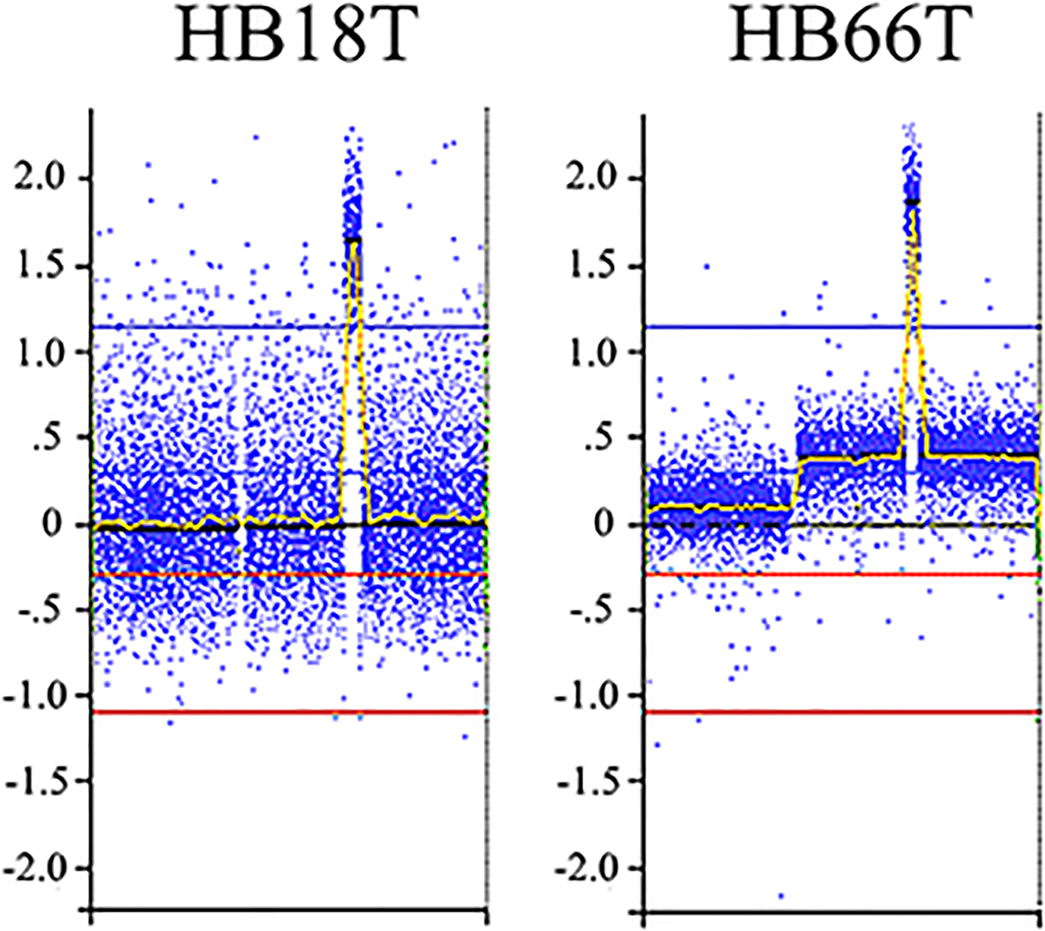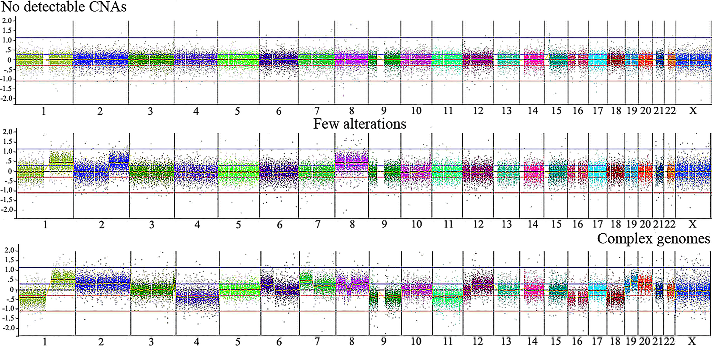 Illustrative CNA profiles representing the three categories of tumors identified by aCGH in the Brazilian HB cohort. No detectable CNA (HB42T), few alterations (HB43T) and complex genomes (HB70T). Microarray probes are plotted according to their genomic coordinates, each color representing a chromosome, from 1 to 22, X, from the short arm to the long arm. The Y axis represents the log2 scale of the copy number ratio tumor/control (values close to 0 indicate regions with similar copy number between tumor and control samples; positive values represent gains; negative values represent losses).