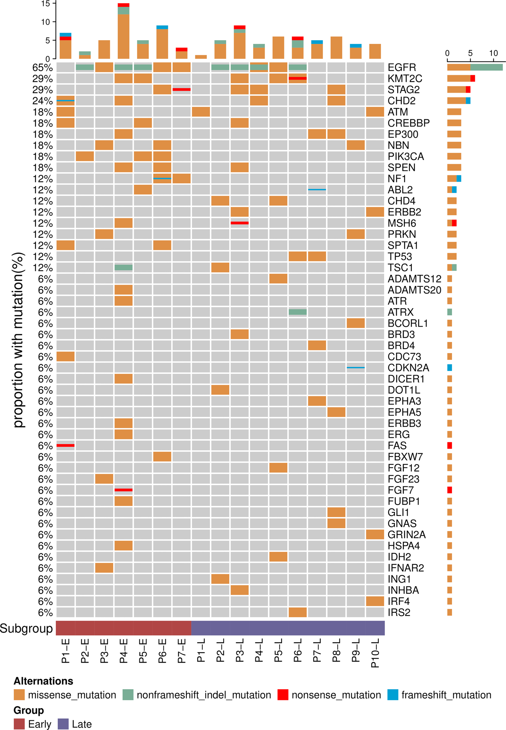 Mutational profiles of early- and late-stage LUAD. Top 50 genes with the highest mutation frequency among the 17 patients. The frequency of each gene mutated in the cohort is displayed on the left.