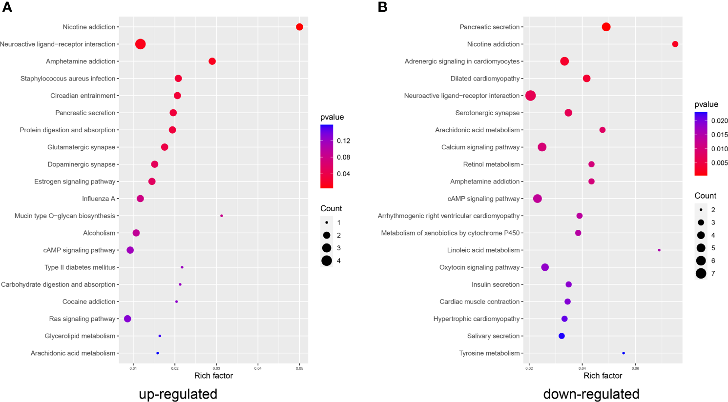 KEGG analysis. Functions and pathways enriched in the (A) upregulated and (B) downregulated genes in the LS group compared to the ES group.