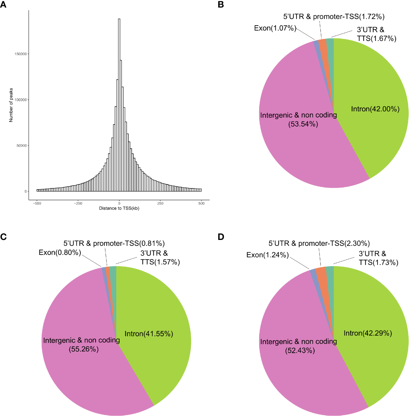 Genomic annotation of open chromatin peaks in the ES and LS samples. (A) Distribution of the distances of peaks to the TSS of the nearest genes. (B–D) Pie charts showing the distribution of peaks in different genomic regions in all 17 samples (B), the ES group (C) and the LS group (D).