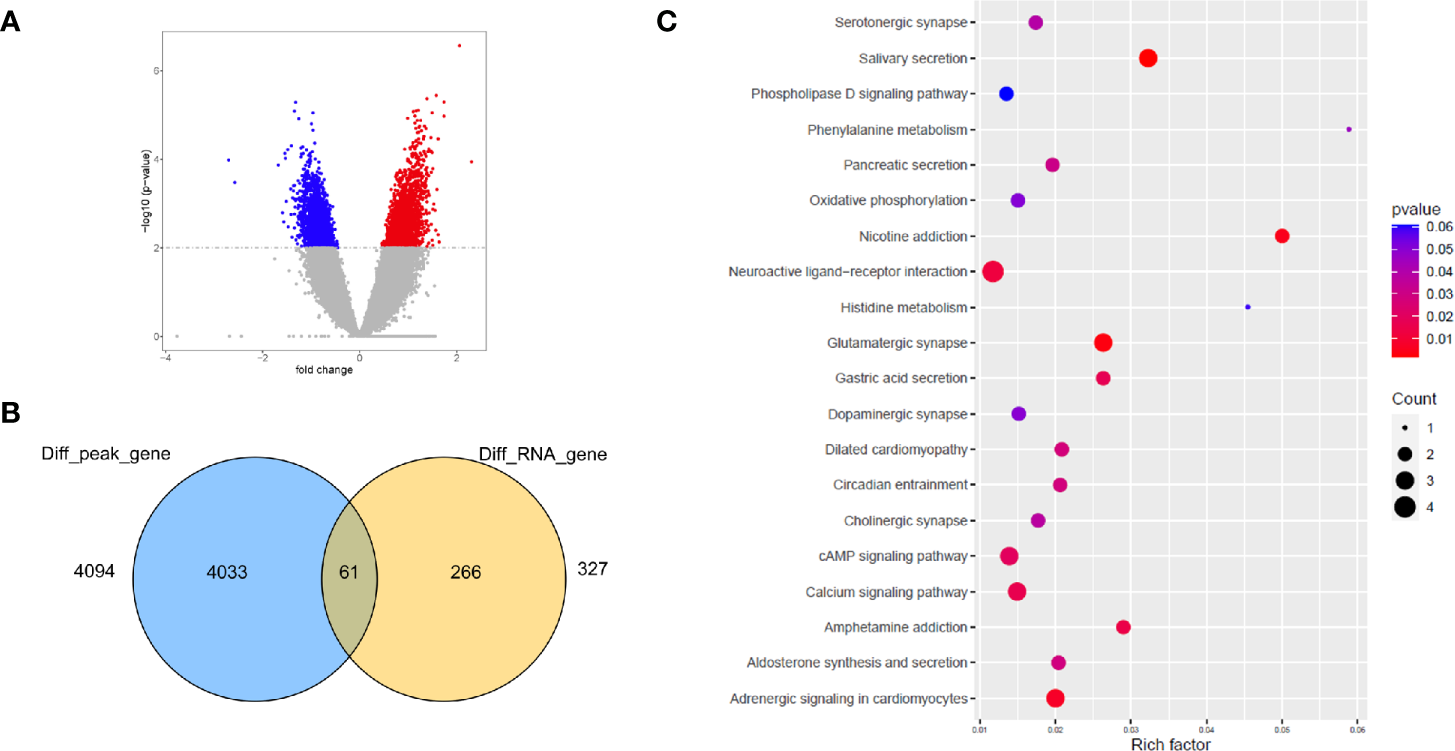 Integrative analysis of open chromatin peaks with DEGs detected by RNA-seq. (A) Volcano plot shows the ATAC-seq peaks specific to the ES (blue) and LS (red) samples. (B) Venn diagram showing the number of differentially abundant ATAC-seq peak-associated genes and DEGs. (C) KEGG pathway enrichment analysis of the overlapping genes of ATAC-seq and RNA-seq.