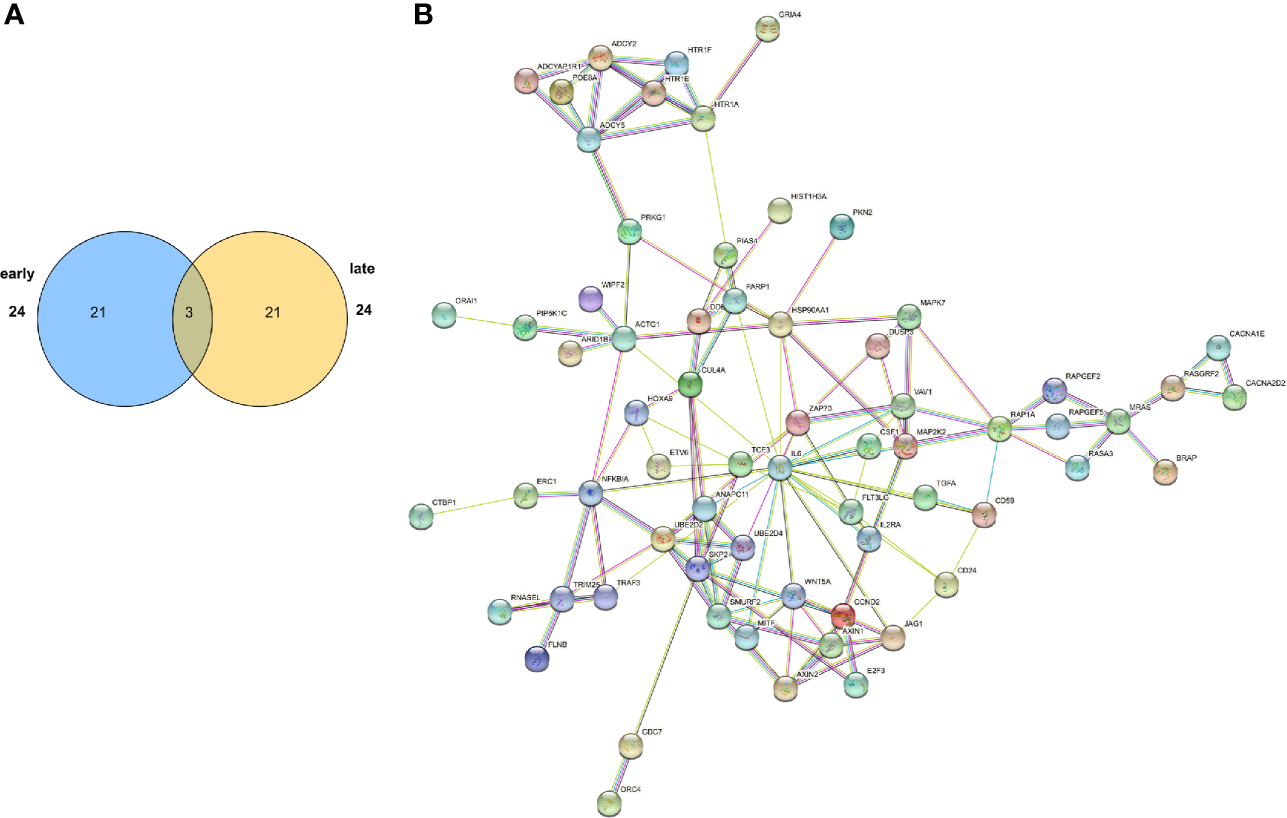Functional and network analysis of differentially abundant open chromatin peaks between the ES and LS groups. (A) Venn plot showing the number of pathways significantly enriched in the ES- or LS-specific ATAC-seq peak-associated genes. (B) STRING network analysis of pathways enriched in the LS-specific ATAC-seq peak-associated genes.