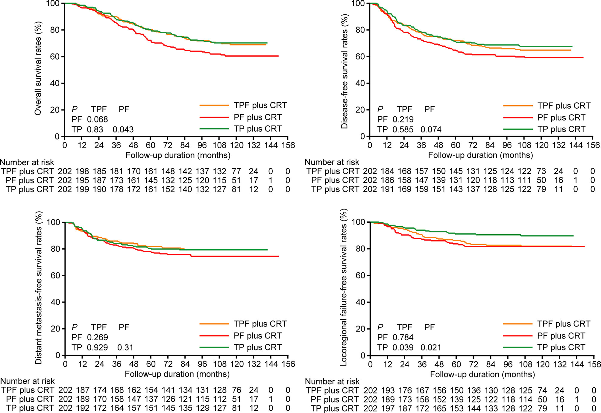 Up to the last follow-up (August 20, 2021), the median follow-up duration was 111.8 months (range, 4.57–149.63 months) for the whole cohort and 120.9 months (range, 7.43–149.63 months) for those alive. Among the patients survived, 9.6% (56/586) of them were lost to follow-up, and only 5 (0.9%) of the remaining patients were followed for less than 9 years (range, 105.2–107.6 months). A total of 269 (31.6%) deaths were observed, with 124 (31.4%) in the TPF plus CRT group, 78 (38.6%) in the PF plus CRT group, and 67 (26.0%) in the TP plus CRT group. Moreover, 85 (21.5%), 45 (11.4%), and 40 (10.1%) patients in the TPF plus CRT group suffered distant, local, and regional recurrence, respectively. The corresponding numbers were 49 (24.3%), 23 (11.4%), and 20 (9.9%) in the PF plus CRT group, and 45 (17.4%), 20 (7.8%), and 8 (3.1%) in the TP plus CRT group. Intriguingly, 29 (3.4%) patients still survived after disease progression and salvage treatments, with 18 (4.6%) in the TPF plus CRT group, 4 (2.0%) in the PF plus CRT group, and 7 (2.7%) in the TP plus CRT group. Notably, 39 new events, which accounted for 13.1% of all events, occurred after 5 years, with 21 (5.3%) in the TPF plus CRT group, 11 (5.4%) in the PF plus CRT group, and 7 (2.7%) in the TP plus CRT group (Supplementary Table S1).