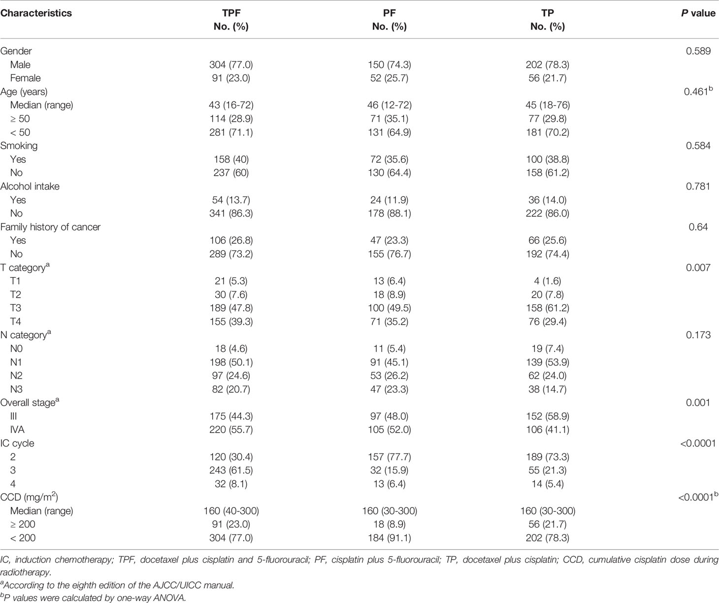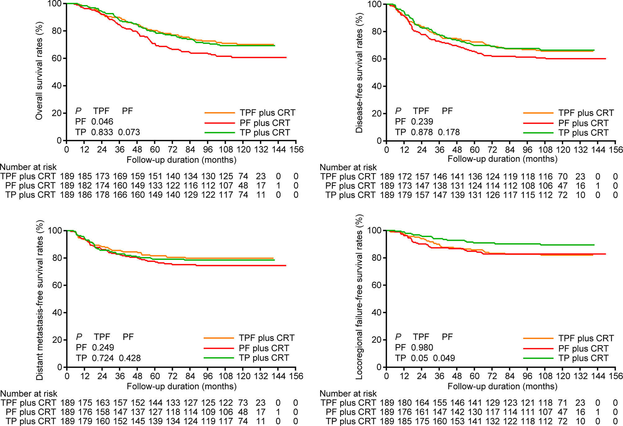 Results: A total of 855 patients between 2009 and 2012 were included, with 395 (46.2%), 258 (30.2%), and 202 (23.6%) receiving TPF plus CRT, TP plus CRT, and PF plus CRT regimens, respectively. After a median follow-up of 111.8 months, multivariate analysis both in the whole cohort and PSM selected 202 pairs showed that TPF plus CRT and TP plus CRT achieved significantly better 10-year overall survival (OS) than PF plus CRT. Sensitivity analysis after excluding patients with T3-4N0 disease demonstrated that TPF plus CRT still achieved significantly better OS than PF plus CRT (HR, 0.580; 95% CI, 0.395-0.852; P = 0.005), while the difference between TP plus CRT and PF plus CRT was marginally significant (HR, 0.712; 95% CI, 0.503-1.008; P = 0.056). With regard to toxicity profile, PF regimen achieved the lowest grade 3–5 toxicities (27.3%).