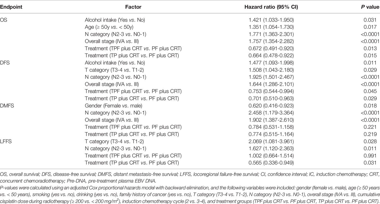 The estimated 10-year OS, DFS, DMFS, and LFFS rates were 67.8%, 64.9%, 78.4%, and 83.8% for the whole cohort, respectively. With regard to the three groups, the estimated 10-year survival rates of TPF vs. TP vs. PF were 67.7% vs. 73.5% vs. 60.5% (PTPF vs. TP = 0.153, PTPF vs. PF = 0.058, PPF vs. TP = 0.003) for OS, 63.6% vs. 71.1% vs. 59.2% (PTPF vs. TP = 0.055, PTPF vs. PF = 0.262, PPF vs. TP = 0.007) for DFS, 77.7% vs. 82.3% vs. 74.5% (PTPF vs. TP = 0.209, PTPF vs. PF = 0.39, PPF vs. TP = 0.063) for DMFS, and 81.2% vs. 89.5% vs. 81.8% (PTPF vs. TP = 0.006, PTPF vs. PF = 0.968, PPF vs. TP = 0.015; Supplementary Figure S1) for LFFS. After adjusting for various factors by an adjusted Cox proportional hazards model, TPF plus CRT (OS: HR, 0.672; 95% CI, 0.491–0.920; P = 0.013; DFS: HR, 0.753; 95% CI, 0.544–0.994; P = 0.045) and TP plus CRT (OS: HR, 0.664; 95% CI, 0.478–0.922; P = 0.015; DFS: HR, 0.701; 95% CI, 0.510–0.963; P = 0.029) were associated with significantly better OS and DFS compared with PF plus CRT (Table 2).