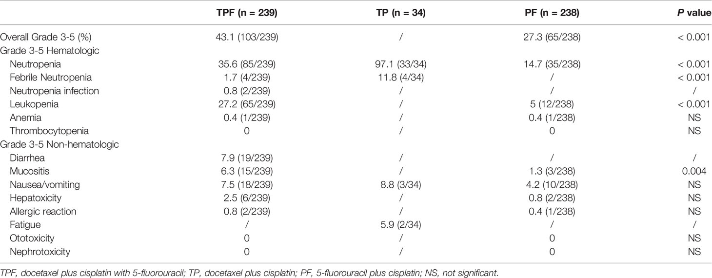 Due to the retrospective nature of our study, IC-related adverse events were not recorded for most of the patients. Therefore, we extracted toxicity data from three previous clinical trials conducted in endemic areas (mainly in South China) (5, 6, 10) to perform indirect comparisons between TPF, TP, and PF regimens.