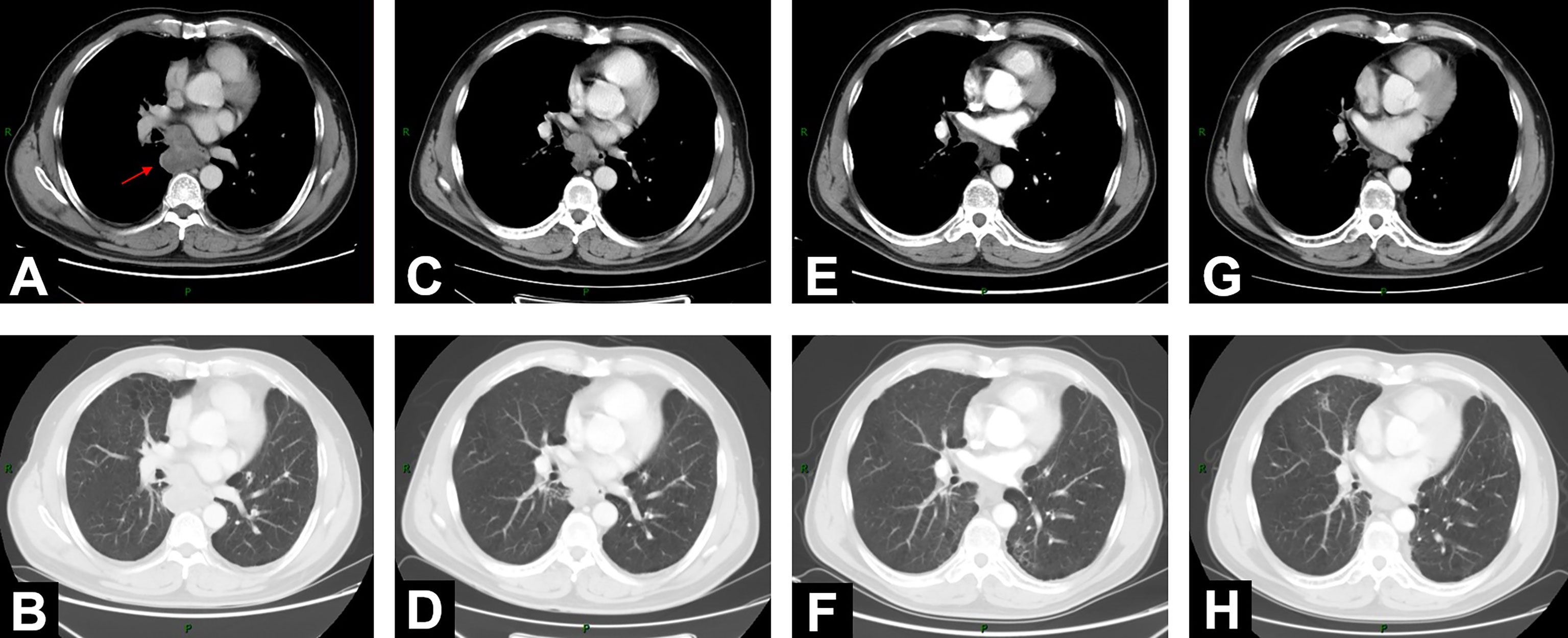 Figure 1 Changes of mediastinal lesion on chest contrast-enhanced CT scans. (A, B) On June 18, 2020, CT demonstrated enlarged mediastinal lymph node station 7 with heterogeneous enhancement (5.2 cm * 4.7 cm). (C, D) CT on August 11, 2020, after 2-cycle induction chemotherapy (3.9 cm * 2.9 cm). (E, F) CT on November 13, 2020 (2.0 cm * 1.5 cm), 1 month after concurrent chemoradiotherapy (cCRT). (G, H) At 1-year follow-up after consolidation durvalumab, CT on October 26, 2021 (1.6 cm * 1.3 cm).