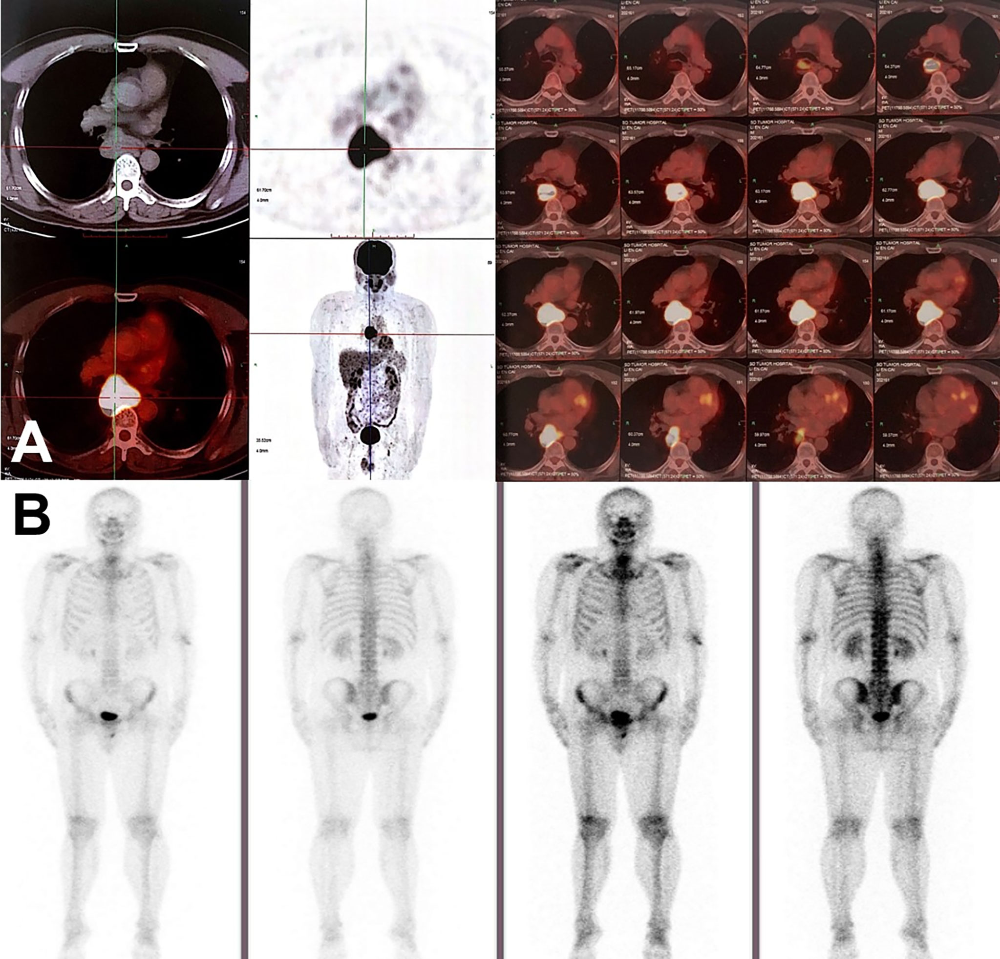On June 18, 2020, 2 years after the left lung bullae resection, CT scan demonstrated an irregularly enlarged mediastinal lymph node station 7 with heterogeneous enhancement, about 5.2 cm * 4.7 cm, considered as the metastasis, but no visible primary pulmonary parenchymal focus (Figures 1A, B). Subsequent bronchoscopy did not reveal any primary lung lesion either. Positron emission tomography (PET)/CT suggested the enlarged mediastinal lymph node station 7 with increased 18F-fluorodeoxyglucose (18F-FDG) uptake and unclear boundary with adjacent esophagus. The corresponding maximum standardized uptake value (SUV) of the enlargement was 22.2, and it was considered a metastasis possibly from a pulmonary origin, while no obvious pulmonary lesion with positive 18F-FDG uptake was found (Figure 2A). Hence, unexpectedly, the primary lesion remained unclear even after PET/CT. No evidence of distant metastasis emerged after performing PET/CT, brain MRI, and whole-body radioactive bone scan (Figure 2B). Physical examination (PE) also was negative.