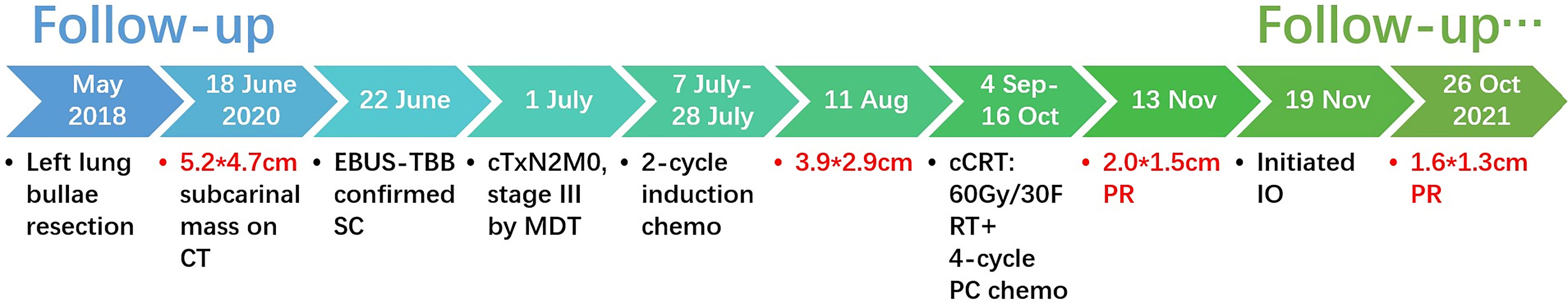 Figure 3 Timeline of the clinical events and treatment strategies. cm, centimeter; PR, partial response; Gy, gray; F, fraction; RT, radiotherapy; PC, nab-paclitaxel + carboplatin; IO, immunotherapy.