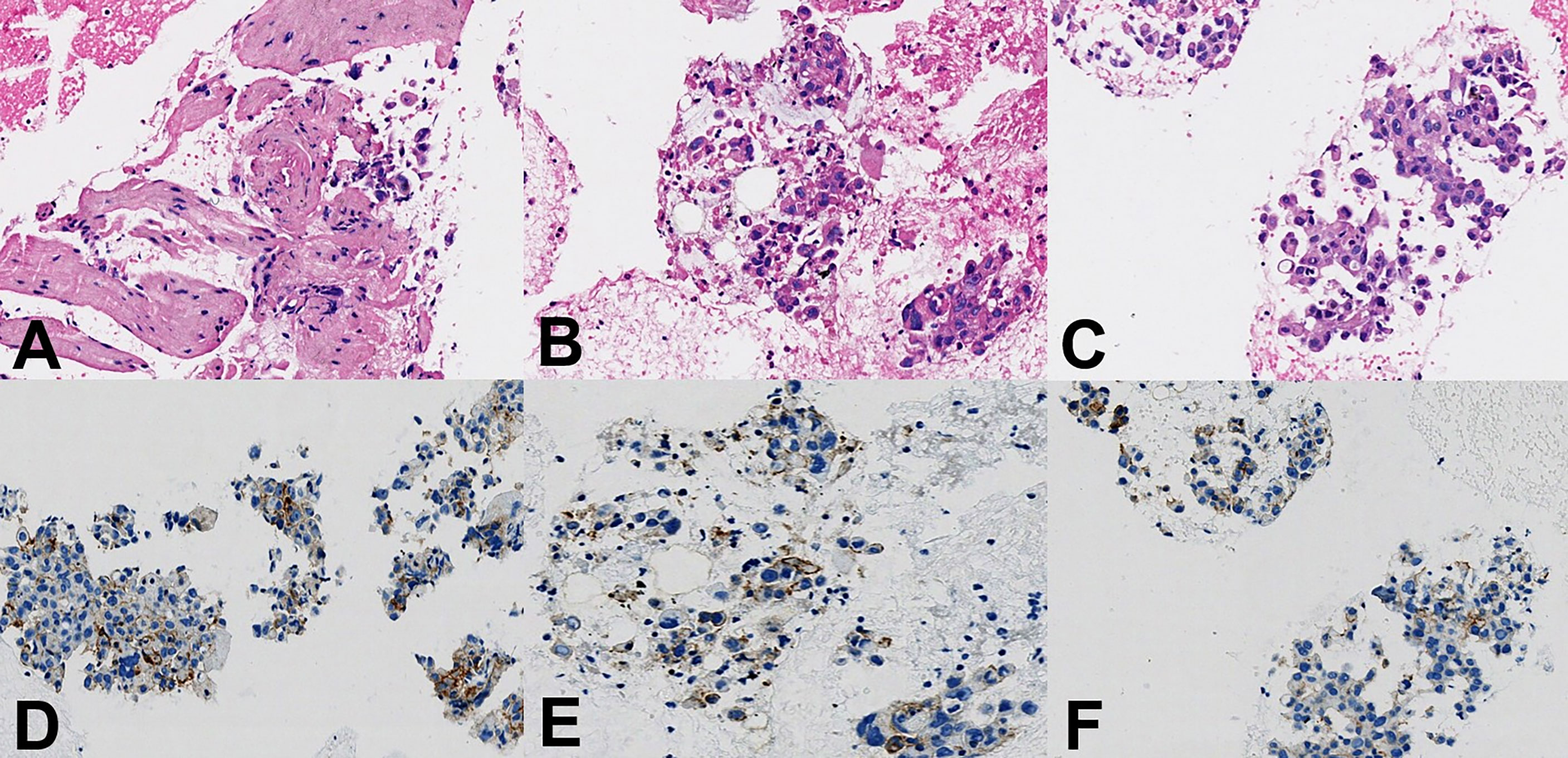 After a series of radiological examinations, the diagnosis was confirmed by the histopathological biopsies. Endobronchial ultrasonography (EBUS) inserted and advanced to the subcarinal mass and then EBUS-guided transbronchial biopsy (EBUS-TBB) confirmed NSCLC, favor pleomorphic carcinoma (Figures 4A–C). Immunohistochemistry (IHC) indicated CK5/6 (+), CK7 (+), Syn (-), CgA (-), P40 (-), CD5 (-), CD117 (-), NUT (-), WT1 (-), D2-40 (-), and Ki67 (60%). The succeeding molecular testing showed negative results, including EGFR/HER2/METex14 skipping/KRAS/NRAS/BRAF mutations (-) and ALK/ROS1/RET fusions (-). IHC staining to assess the expression of PD-L1 showed that the tumor proportion score (TPS) was 40% (Figures 4D–F).