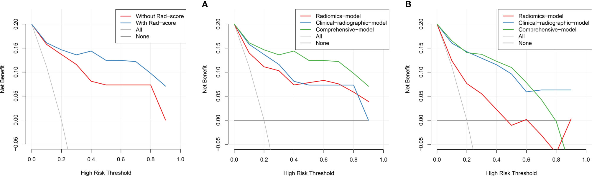 Figure 5 The DCA showed that in most circumstances, using the comprehensive model to distinguish between SPLCs and PMs would be more clinically beneficial than other models in training cohort (A) and validation cohort (B).