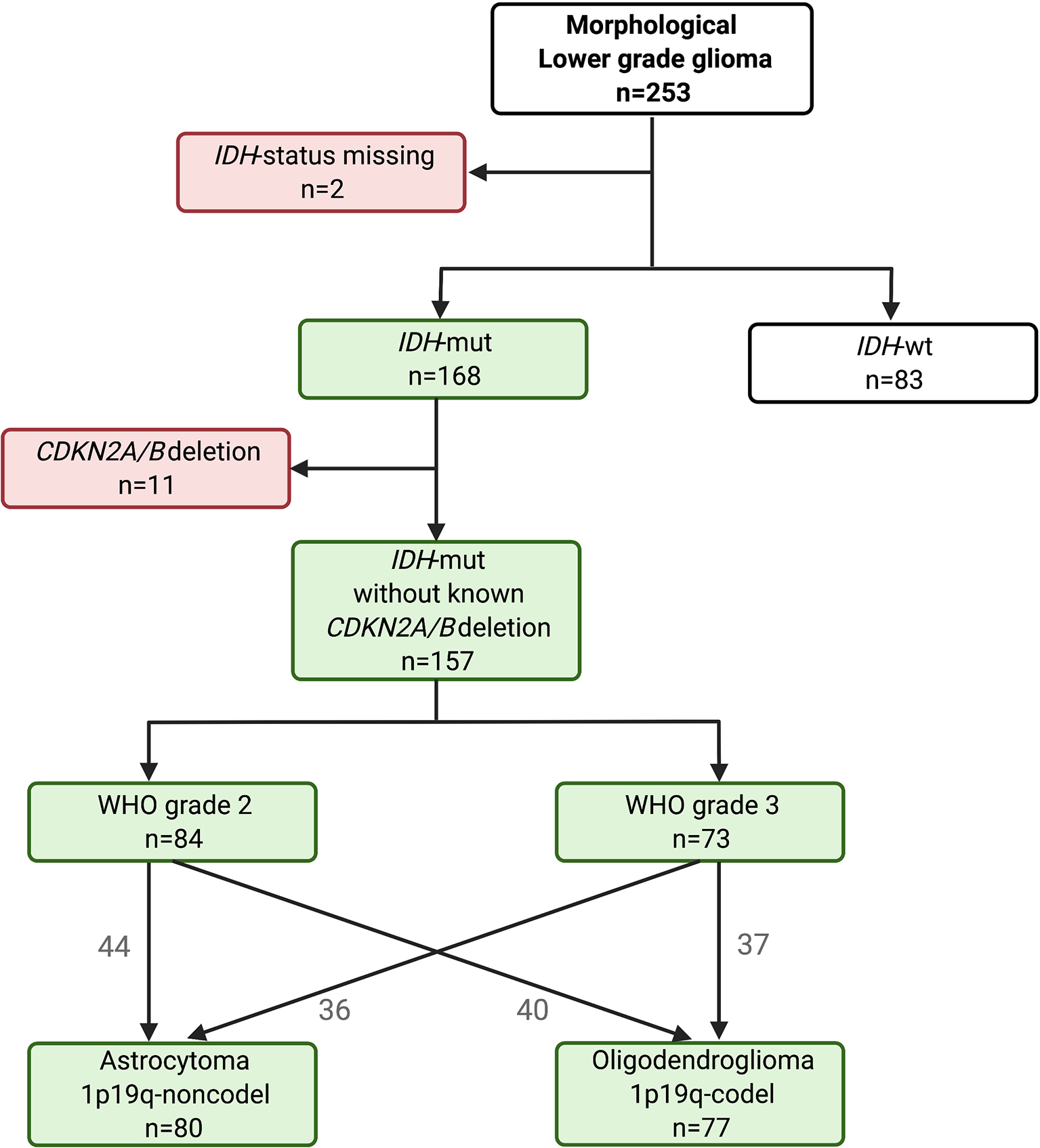 A total of 253 adults with morphological dLGG, consecutively included between 2007 and 2018, were assessed. IDH mutations, codeletion of chromosomal arms 1p/19q, and cyclin-dependent kinase inhibitor 2A/B (CDKN2A/B) deletions were analyzed.
